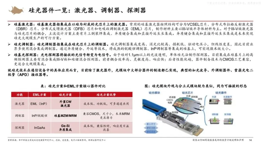 硅光模块核心由光器件 + 电芯片组成,光器件为核心功能单元,电芯片负责信号处理,各核心器件主流方案与发展方向明确: