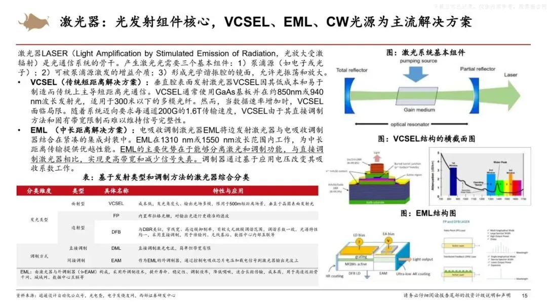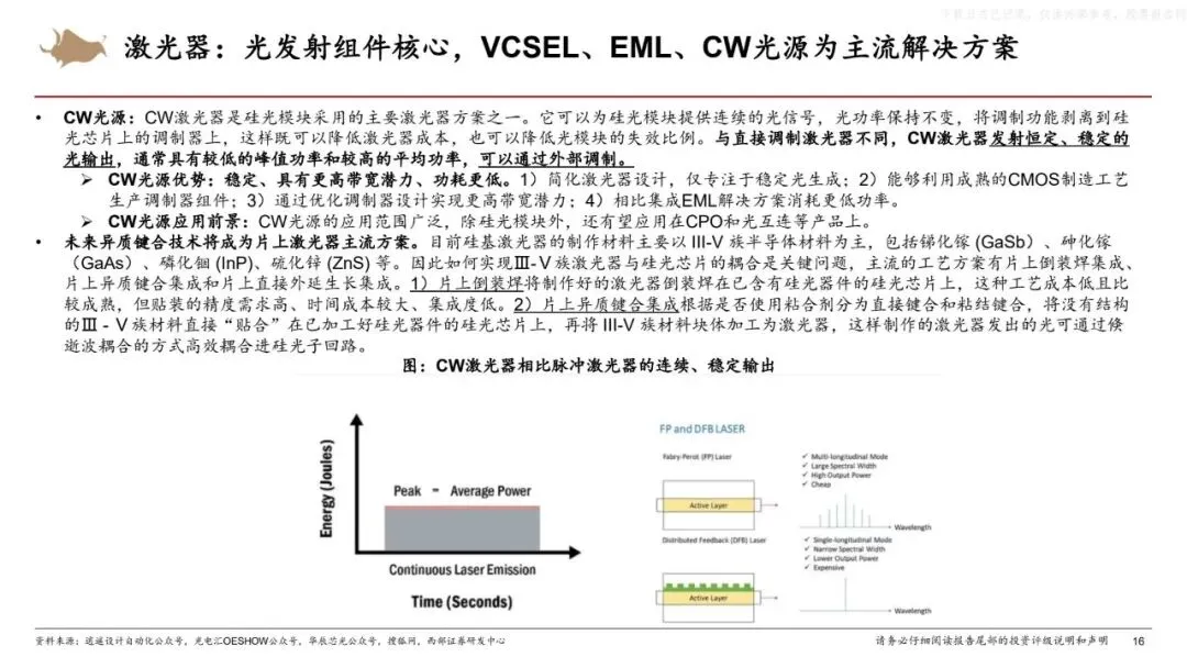 - CW 光源:核心材料为 InP,InP 衬底由住友电工、AXT 寡头垄断;国内供应商为源杰科技(绑定中际旭创)、仕佳光子,部分 EML 厂商跨界布局;