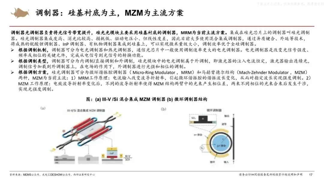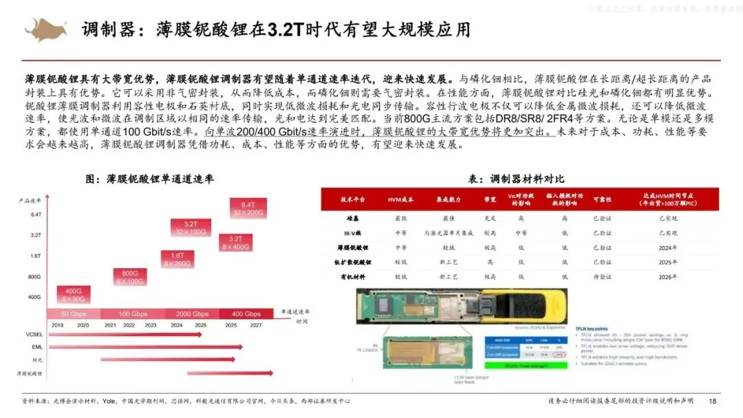 - 调制器:提升光信号带宽,硅基衬底为主,MZM(马赫曾德尔)是当前主流;薄膜铌酸锂调制器因大带宽优势,在 3.2T 时代有望大规模应用;