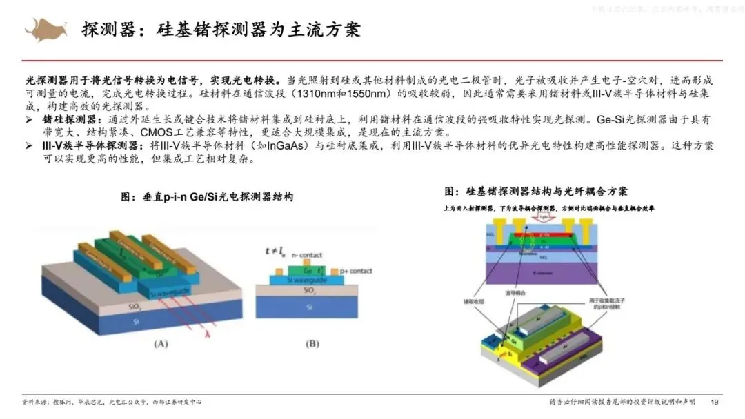 - 探测器:光信号转电信号,硅基锗探测器是主流方案,CMOS 工艺兼容、适合大规模集成;