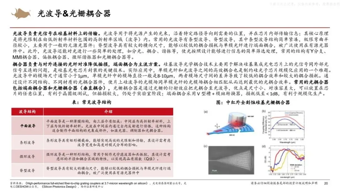 - 无源器件:包括(解)复用器、谐振腔 / 滤波器、光波导、光栅耦合器等,负责光信号传输、筛选、光纤对准,端面耦合是光栅耦合器的规模化量产方案;