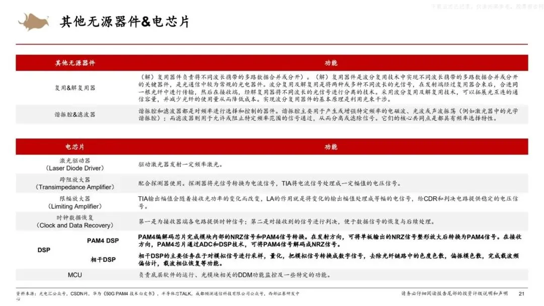 - 电芯片:含 DSP、TIA、Driver、MCU 等,其中 DSP 是核心,由博通、Marvell 设计,台积电代工,存在供给缺口。