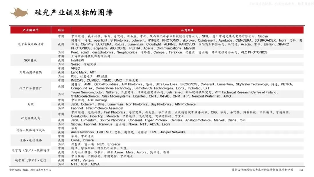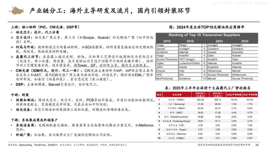 - 硅光芯片:设计与代工分离,设计由北美厂商主导,中际旭创、新易盛等国内光模块厂商自研突破;代工环节由 Tower Semi、格芯(GF)、台积电垄断,国内中芯国际布局国产替代;
