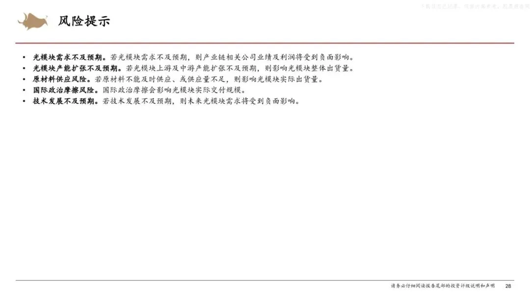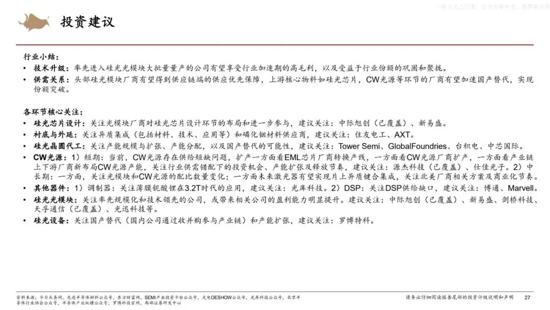 - 供需端:头部厂商获供应链优先保障,上游核心物料(硅光芯片、CW 光源)国产替代加速,迎来份额突破;