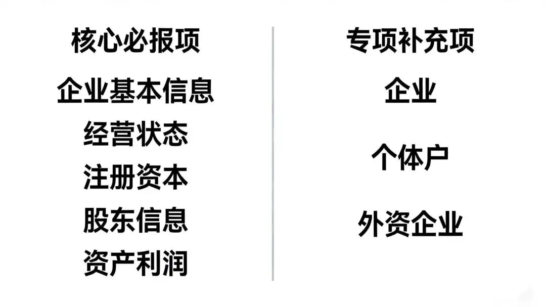 ① 企业:需补充对外投资情况、分支机构情况、社保缴纳情况、公积金缴纳情况;② 个体户:补充从业人数、资金数额、是否有对外经营(无则填 “无”);③ 外资企业:额外补充外国投资者出资情况、年度审计报告相关信息。