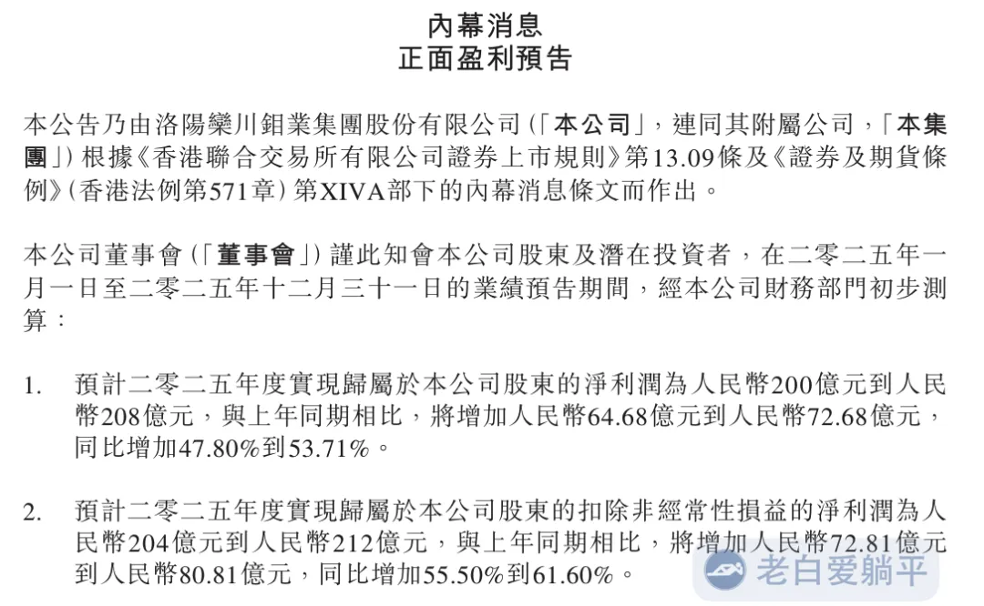 我们来看两个预告的例子,第一个是洛阳钼业对2025年业绩的盈利预告,因为其利润增加了50%左右: