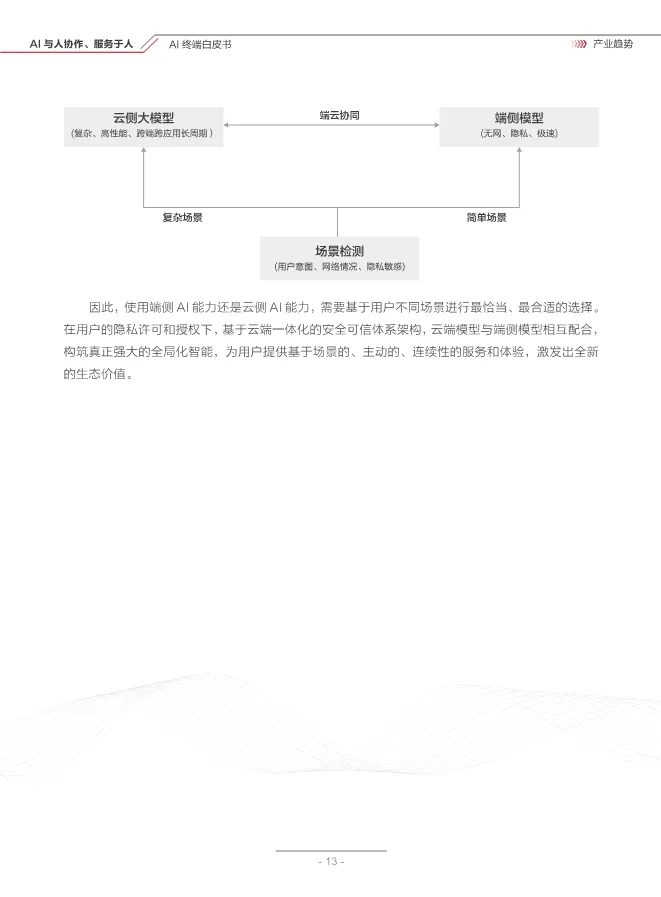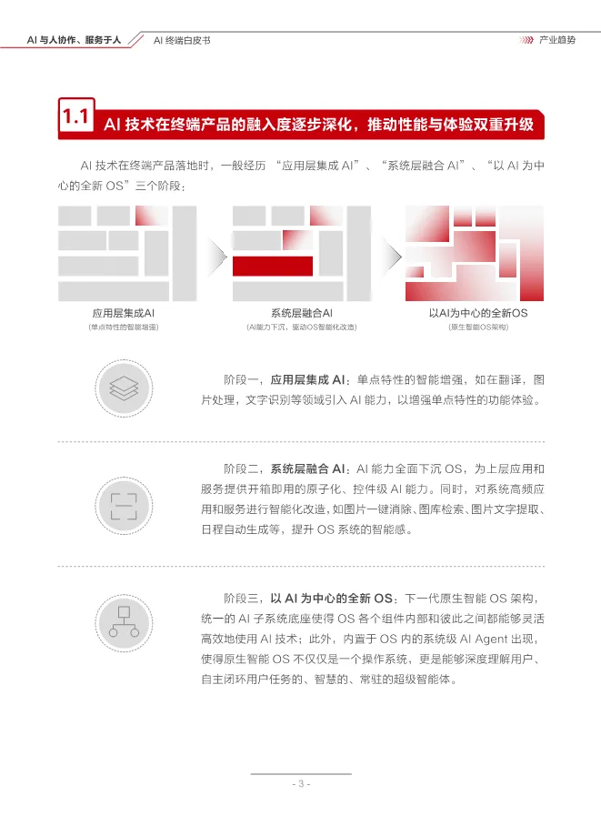 白皮书把终端 AI 发展划分为三个阶段:从应用层单点智能增强,到系统层全面融合 AI,最终走向以 AI 为中心的原生智能 OS,重构整个操作系统的底层架构,让 AI 真正成为终端的技术底座。