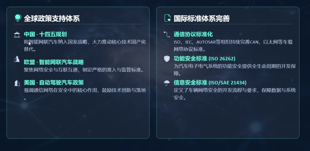 全球各国纷纷出台相关政策,推动汽车电子电气架构与通信网络的技术创新和标准化建设。这是必然,都不想在这波狂潮中落后其他。我国将智能网联汽车纳入“十四五”战略性新兴产业发展规划,明确提出突破电子电气架构、车载通信等核心技术,推动车规级芯片、通信协议等国产化替代;欧盟通过《智能网联汽车战略》,聚焦车载通信网络的安全性与互联互通,推动时间敏感网络(TSN)等技术的标准化与产业化;美国出台《自动驾驶汽车政策》,强调通信网络在自动驾驶安全中的核心作用,加快V2X通信技术的部署与应用。