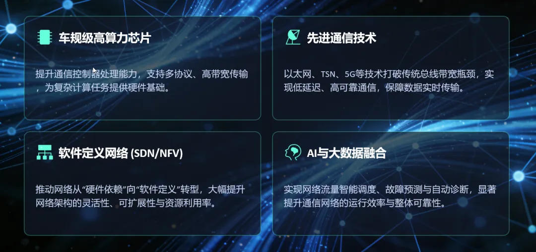 半导体、通信、软件等领域的技术突破,为电子电气架构通信网络的升级提供了有力支撑。车规级高算力芯片(SoC)的量产的应用,提升了通信控制器的处理能力,支持多协议、高带宽的数据传输;以太网、TSN、5G等通信技术的迭代,打破了传统总线的带宽瓶颈,实现了低延迟、高可靠的实时通信;软件定义网络(SDN)、网络功能虚拟化(NFV)等技术的应用,推动通信网络从“硬件依赖”向“软件定义”转型,提升了网络的灵活性与可扩展性。此外,人工智能、大数据等技术与通信网络的深度融合,实现了网络流量的智能调度、故障的预测与诊断,进一步提升了通信网络的运行效率与可靠性。