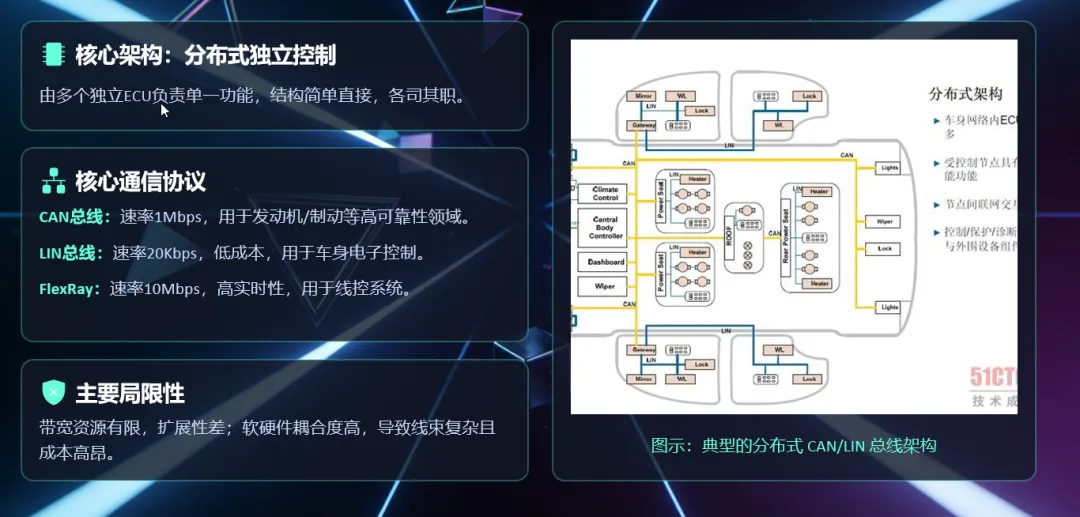 这一阶段的电子电气架构以分布式为主,整车由多个独立的ECU组成,每个ECU负责单一功能(如发动机控制、灯光控制、门窗控制等),通信网络以低速总线为主,核心目标是解决“能不能通信”的基础问题,实现各ECU之间的简单指令传输。