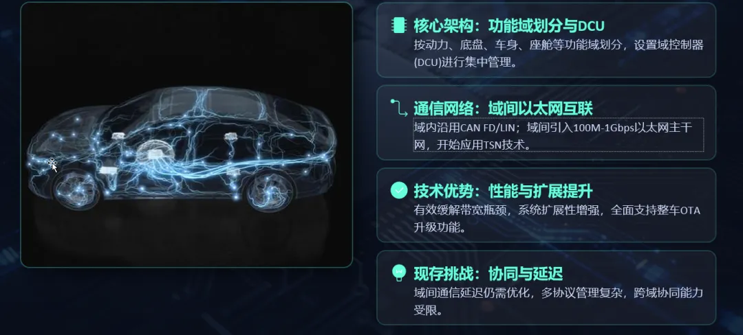 TSN技术开始逐步应用于域间通信,通过统一的时间基准、确定性调度机制,实现了安全与非安全流量的共网承载与隔离,确保了自动驾驶、底盘控制等关键数据的实时传输。这一阶段的通信网络,有效解决了分布式总线阶段的带宽瓶颈和系统扩展性问题,实现了软硬件的初步解耦,支持OTA升级,为智能座舱、ADAS等技术的落地提供了支撑。但仍存在不足:一是域间通信的延迟仍需优化,难以满足L4及以上级别自动驾驶的需求;二是多协议并存导致网络管理复杂,增加了研发与测试成本;三是域控制器之间的协同能力有限,难以实现整车级的全局优化。