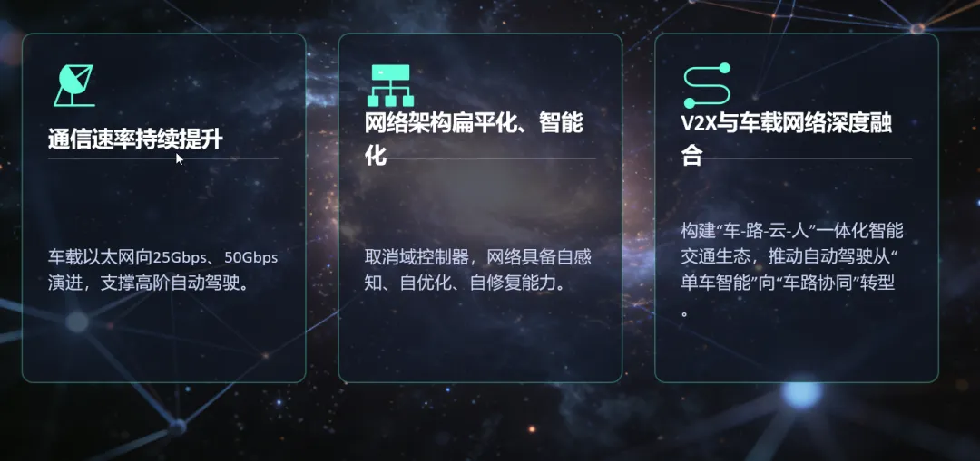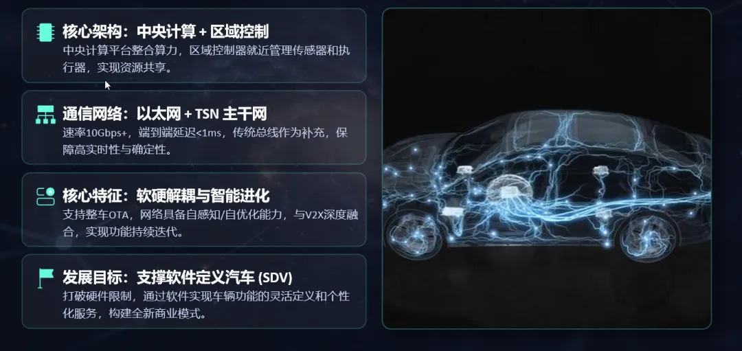 随着L4及以上级别自动驾驶、全场景智能座舱、V2X车路协同等技术的发展,域集中式混合网络已无法满足高带宽、低延迟、高可靠、高协同的核心需求,电子电气架构向中央集中式演进,通信网络进入智能网络阶段,核心目标是实现“确定性、可预测性与系统级协同能力”,支撑软件定义汽车(SDV)的发展。