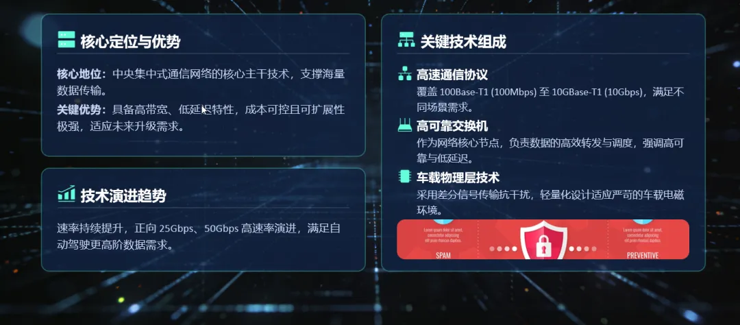 车载以太网是中央集中式通信网络的核心主干技术,相较于传统总线,具有高带宽、低延迟、低成本、可扩展性强等优势,能够满足海量传感器数据、高清视频、OTA升级等高速数据传输需求。车载以太网的核心技术包括以下几个方面:
