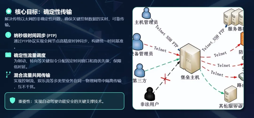 -> 二是以太网交换机技术,车载以太网交换机作为网络的核心节点,负责数据的转发与调度,需要具备高可靠性、低延迟、抗干扰能力强的特点,同时支持多协议兼容,实现与传统总线的互联互通。