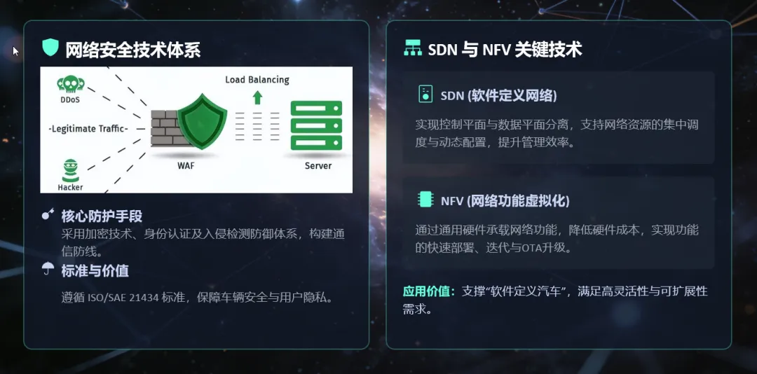 在车载通信网络中,SDN与NFV技术的应用,能够实现网络资源的优化配置,提升网络的运行效率,同时支持OTA升级,实现网络功能的快速迭代,满足软件定义汽车的发展需求。例如,通过SDN技术,可根据自动驾驶的需求,动态分配网络带宽,确保传感器数据的实时传输;通过NFV技术,可将网关、防火墙等功能虚拟化,降低硬件成本,同时提升网络的灵活性与可扩展性。