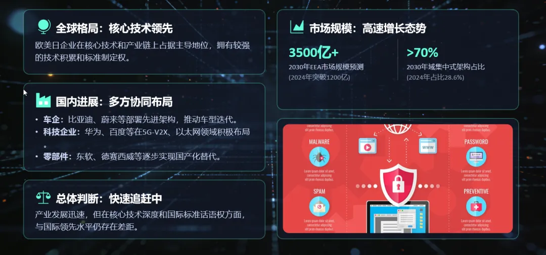 当前,全球电子电气架构通信网络产业正处于快速发展阶段,国内外车企、零部件企业、科技企业纷纷加大研发投入,推动核心技术的突破与产业化落地,形成了多元化的产业格局。
