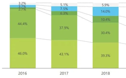2016年~2018年,职业教育及成人语言和高等学历教育占据了绝大部份的市场份额,两者之和占据了超过70%的中国在线教育市场份额。