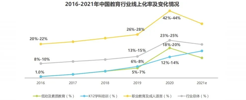 2020年疫情影响下,一方面线上教育快速开采,同时线下教育规模大幅缩水,整体和细分市场的线上化率有较大提升。而随着疫情影响减弱,居民教育生活回归正轨,预计行业的线上化率会出现一定幅度下降。