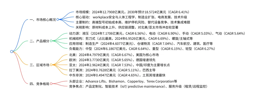 2024 年全球升降台市场规模达12.7908亿美元,预计2030年将增至 18.5724亿美元,年复合增长率6.41%,市场增长主要受workplace安全与人体工程学重视、制造业扩张、电子商务发展及技术自动化升级驱动;产品按动力源可分为液压(2024年占比最高,7.1706 亿美元)、电动(增速最快,CAGR 6.90%)、手动和气动类型,按应用覆盖制造生产、仓储物流(增速最快,CAGR 7.04%)等多个领域;亚太地区是增速最快的区域市场(CAGR 7.53%),北美为最大区域市场(2024年4.7979亿美元),同时关税战对原材料成本、供应链产生一定影响,市场竞争集中于产品定制化、智能技术集成及服务升级。