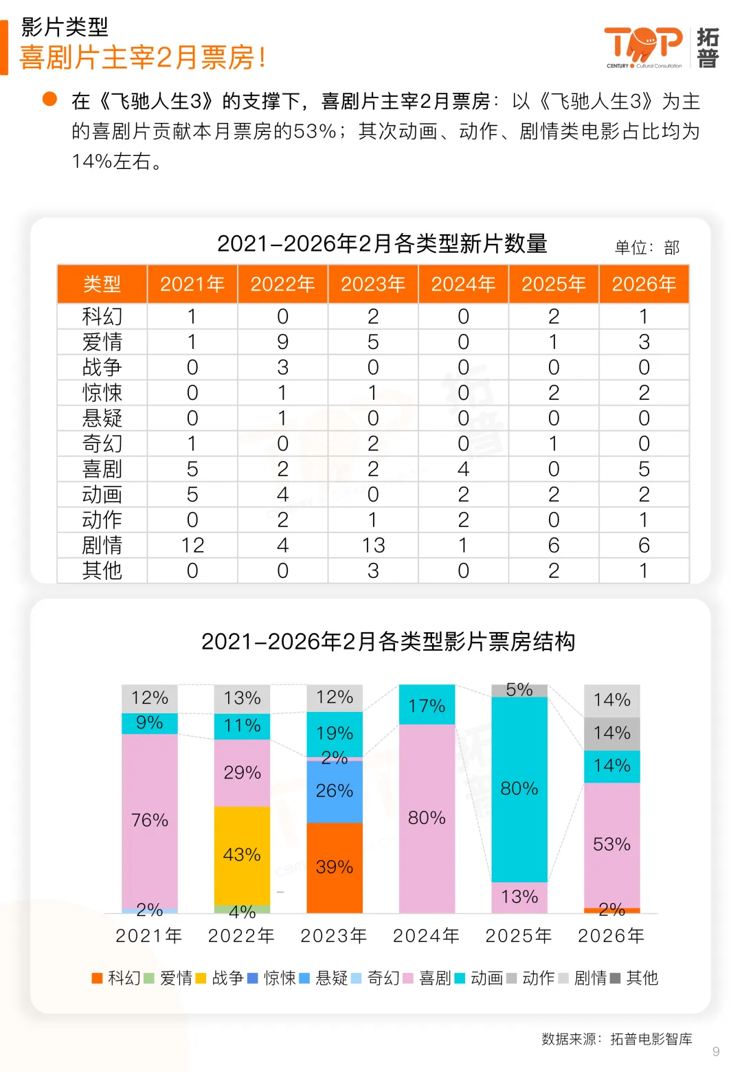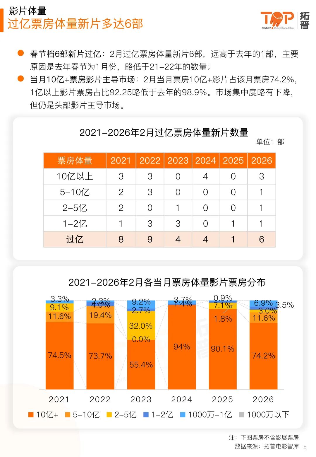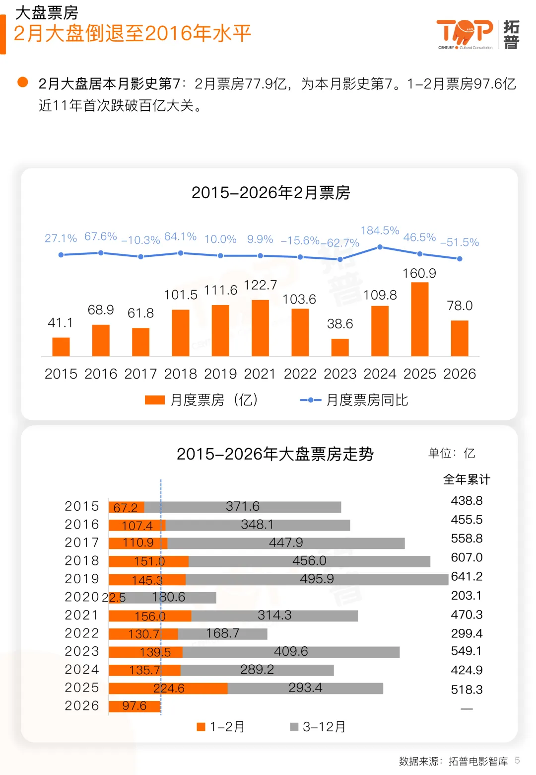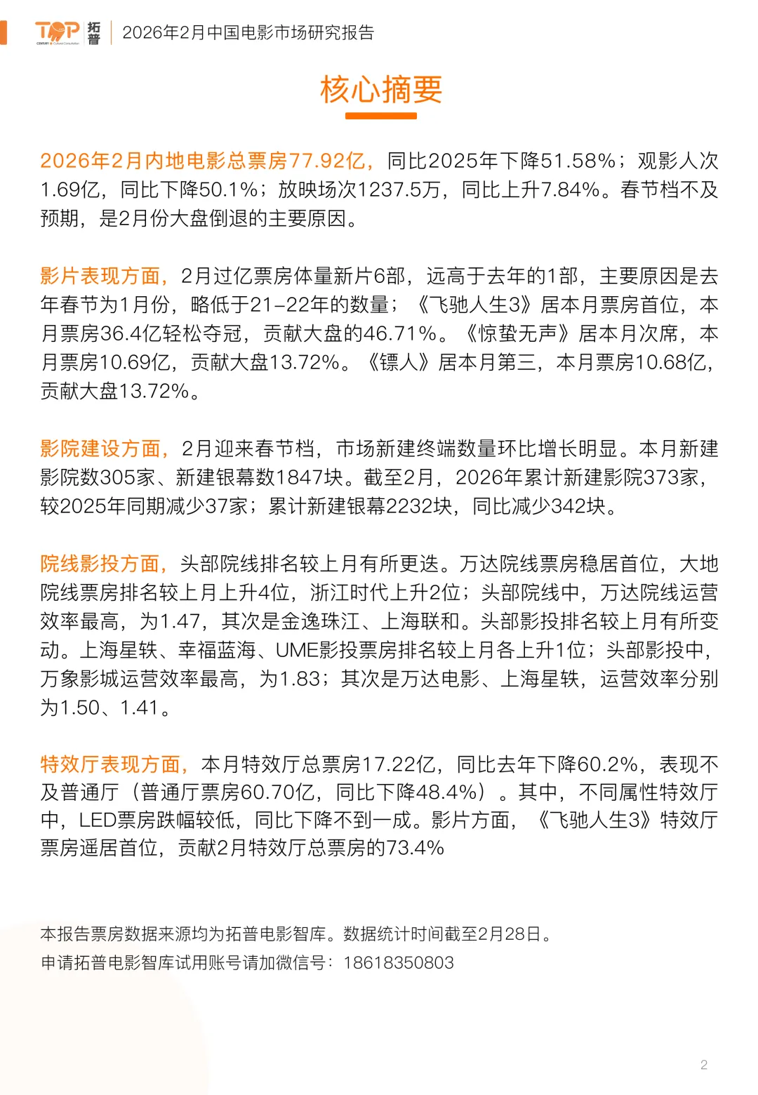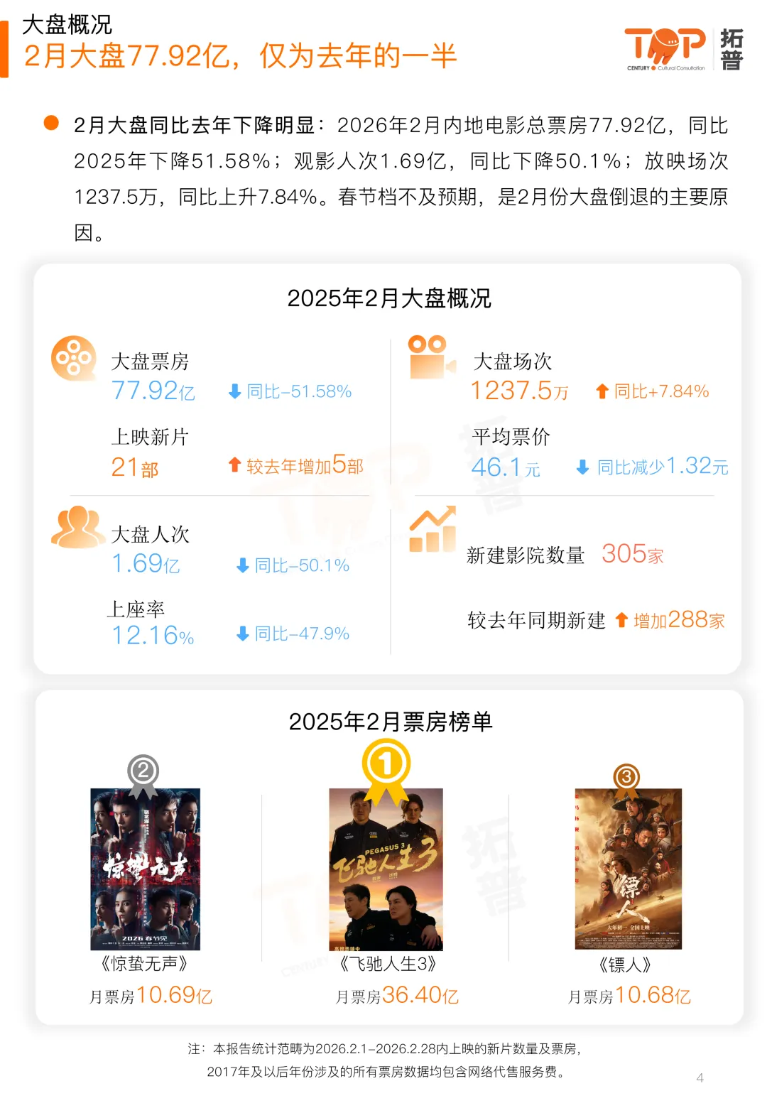 2026年2月内地电影总票房77.92亿,同比2025年下降51.58%;观影人次1.69亿,同比下降50.1%;放映场次1237.5万,同比上升7.84%。春节档不及预期,是2月份大盘倒退的主要原因。