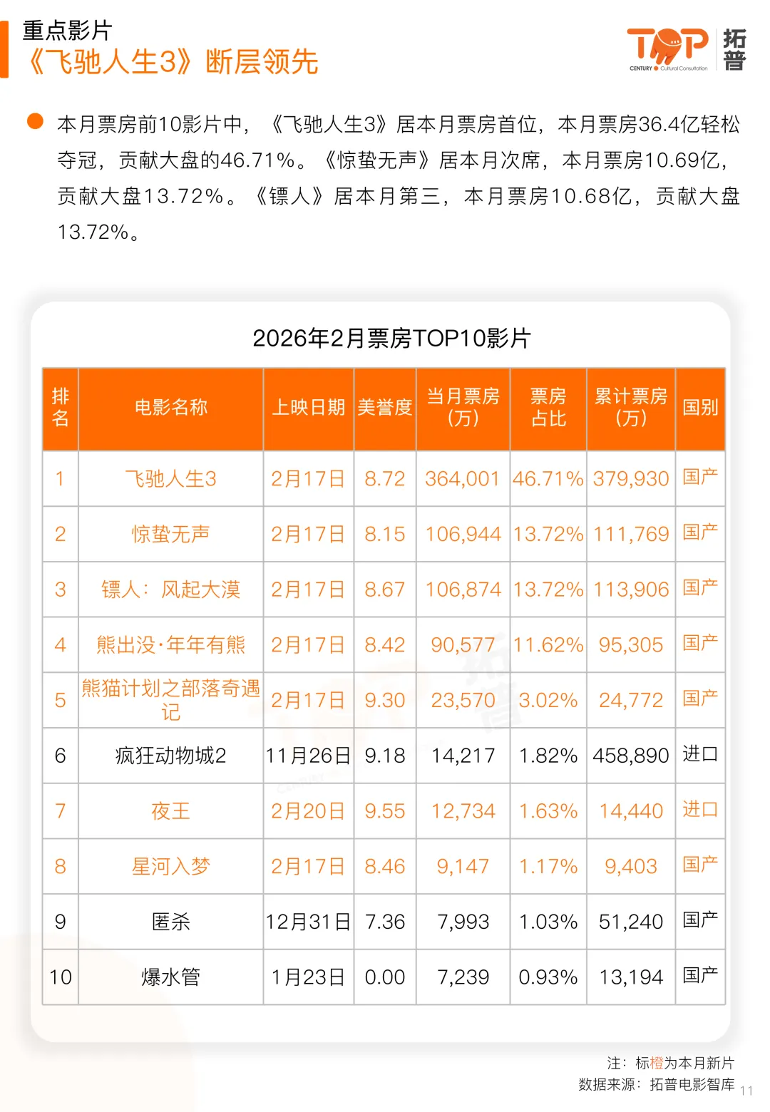 影片表现方面,2月过亿票房体量新片6部,远高于去年的1部,主要原因是去年春节为1月份,略低于21-22年的数量;《飞驰人生3》居本月票房首位,本月票房36.4亿轻松夺冠,贡献大盘的46.71%。《惊蛰无声》居本月次席,本月票房10.69亿,贡献大盘13.72%。《镖人》居本月第三,本月票房10.68亿,贡献大盘13.72%。