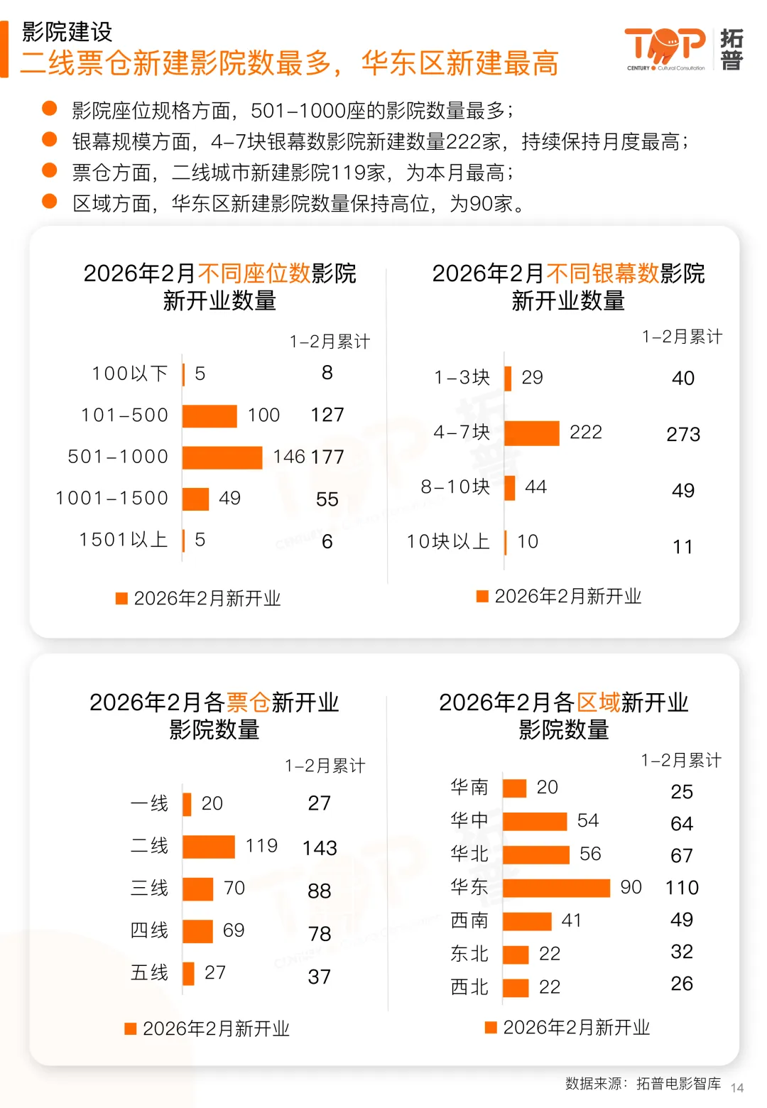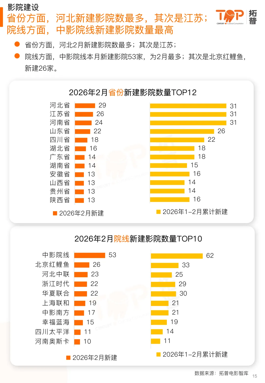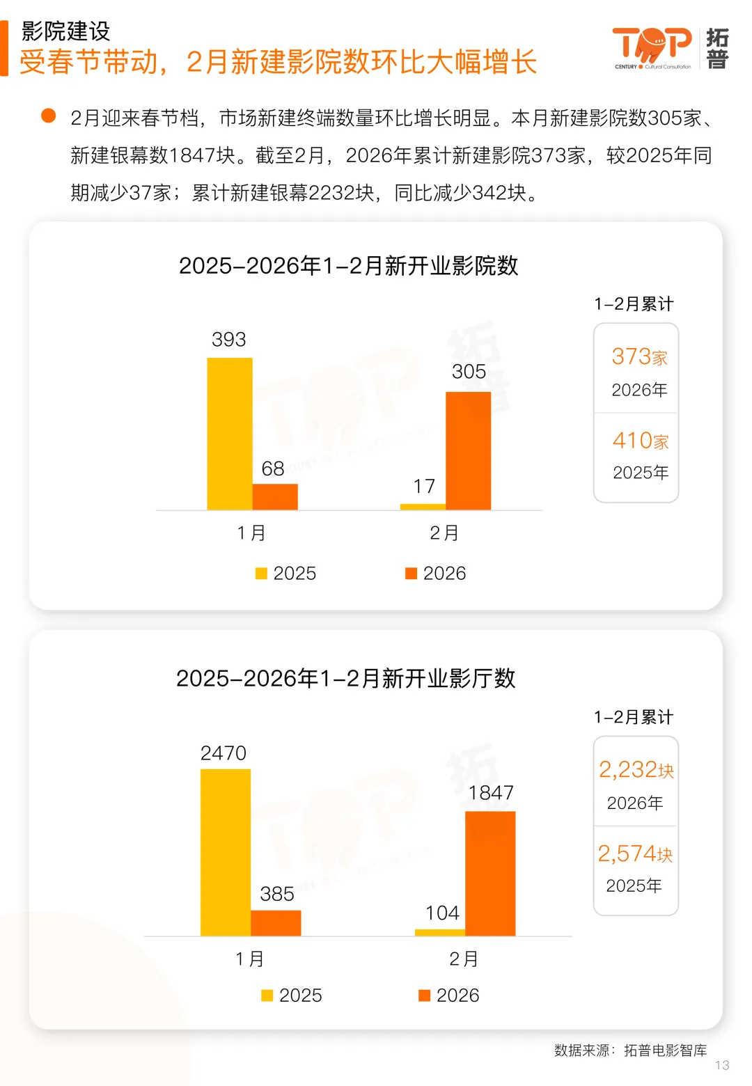 影院建设方面,2月迎来春节档,市场新建终端数量环比增长明显。本月新建影院数305家、新建银幕数1847块。截至2月,2026年累计新建影院373家,较2025年同期减少37家;累计新建银幕2232块,同比减少342块。