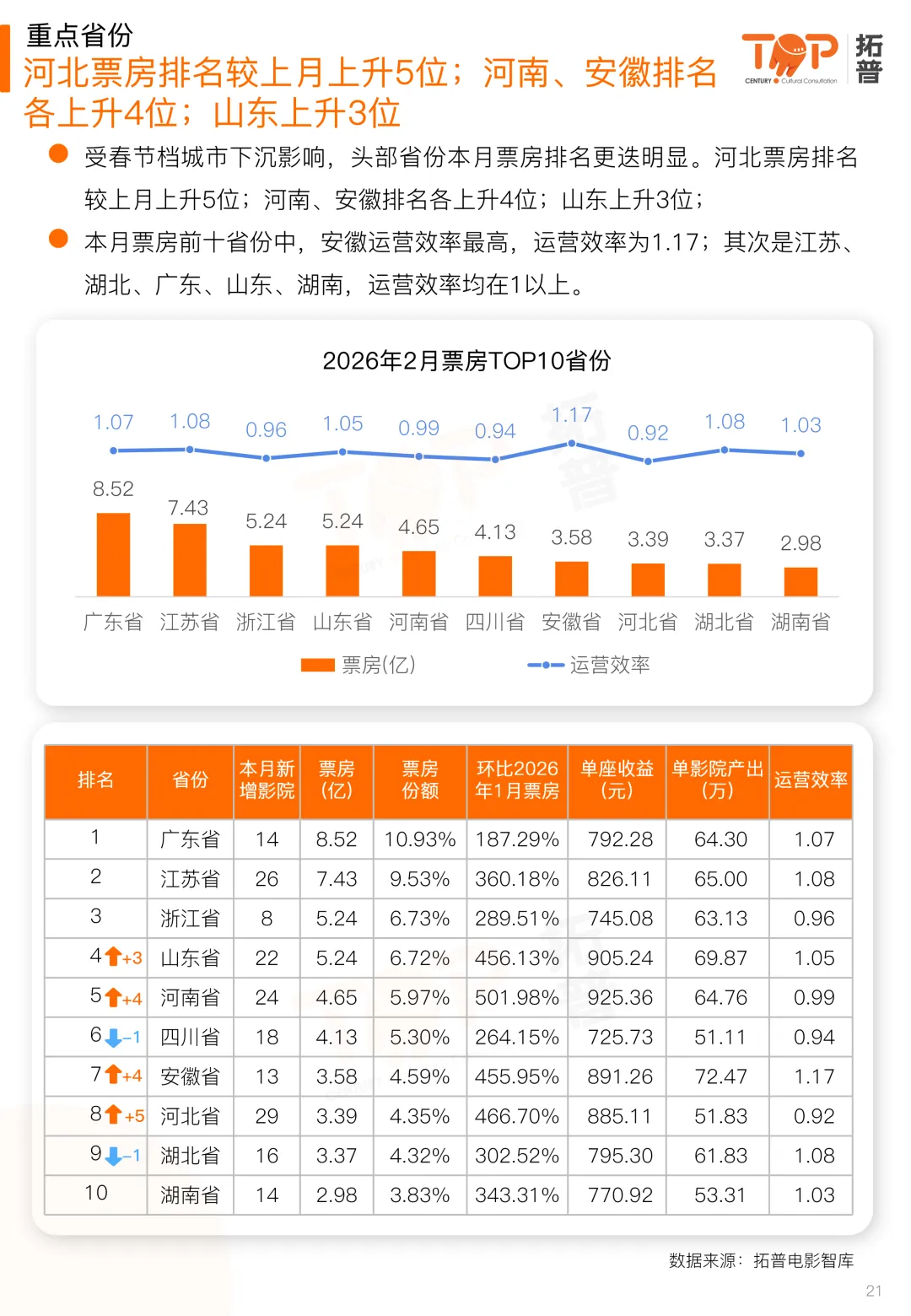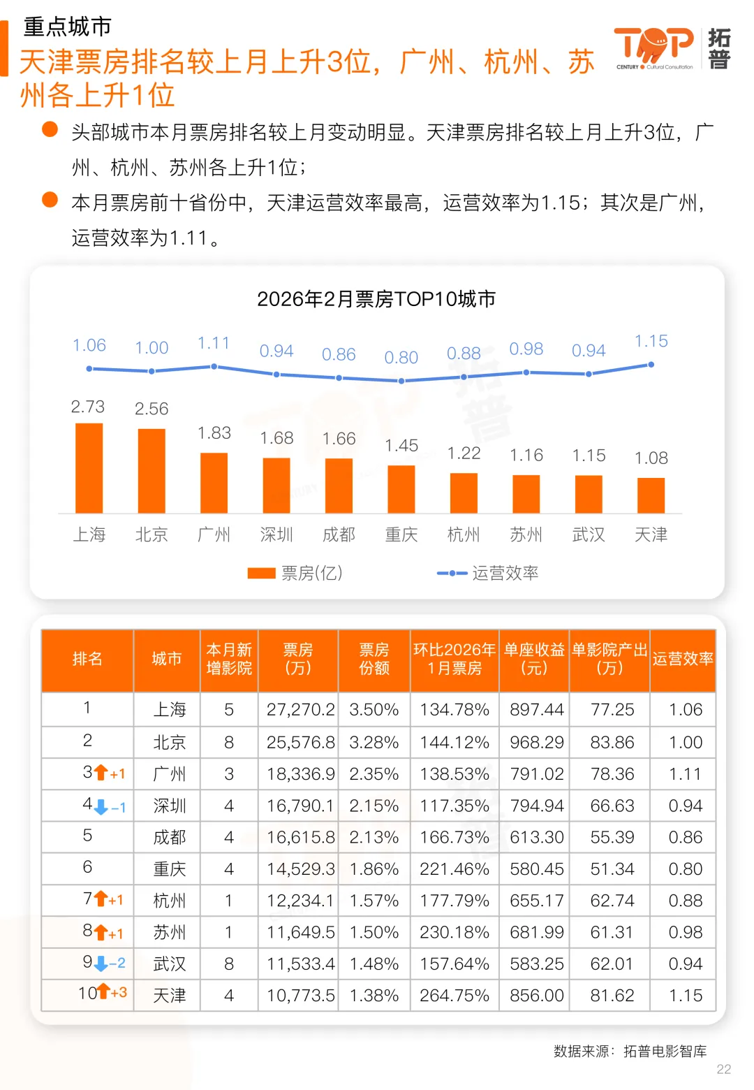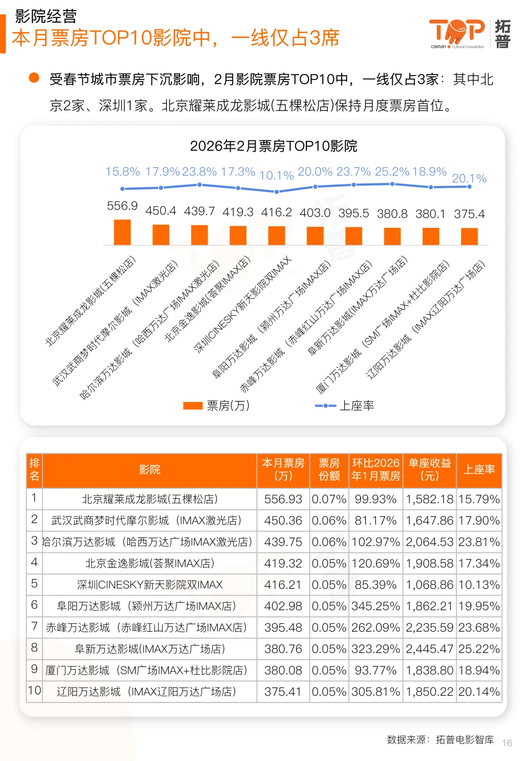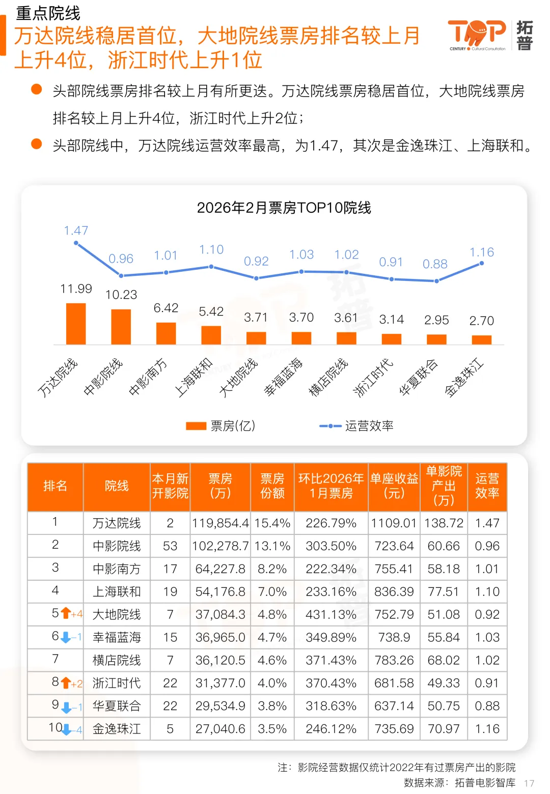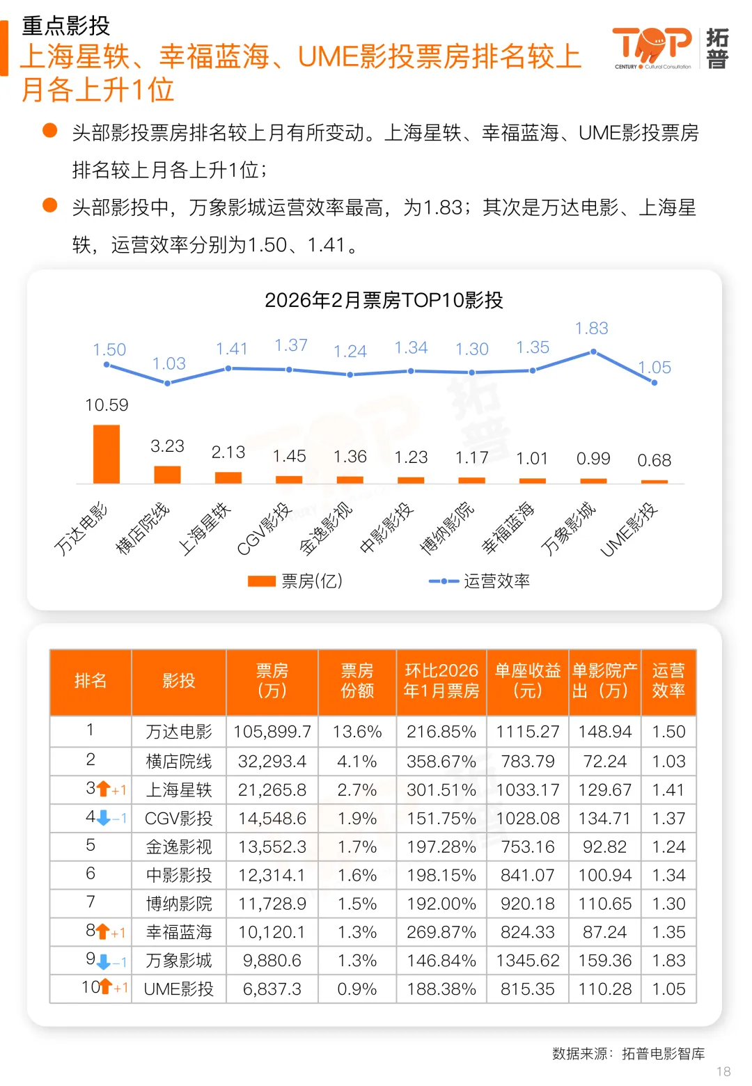 院线影投方面,头部院线排名较上月有所更迭。万达院线票房稳居首位,大地院线票房排名较上月上升4位,浙江时代上升2位;头部院线中,万达院线运营效率最高,为1.47,其次是金逸珠江、上海联和。头部影投排名较上月有所变动。上海星轶、幸福蓝海、UME影投票房排名较上月各上升1位;头部影投中,万象影城运营效率最高,为1.83;其次是万达电影、上海星轶,运营效率分别为1.50、1.41。