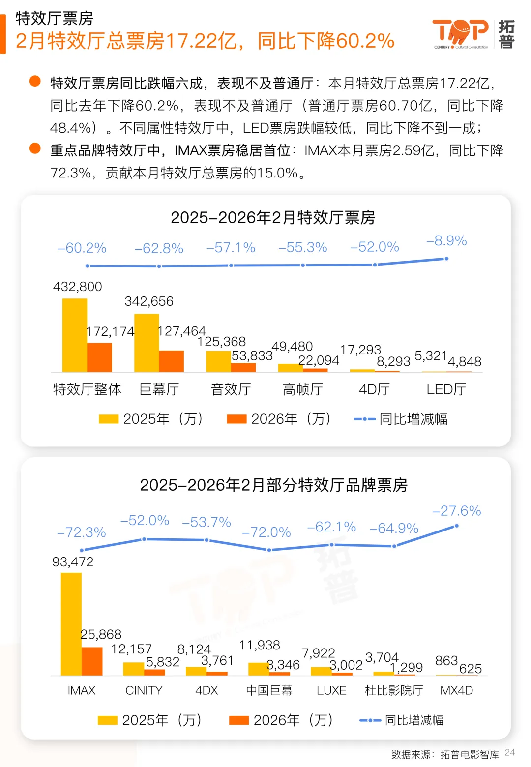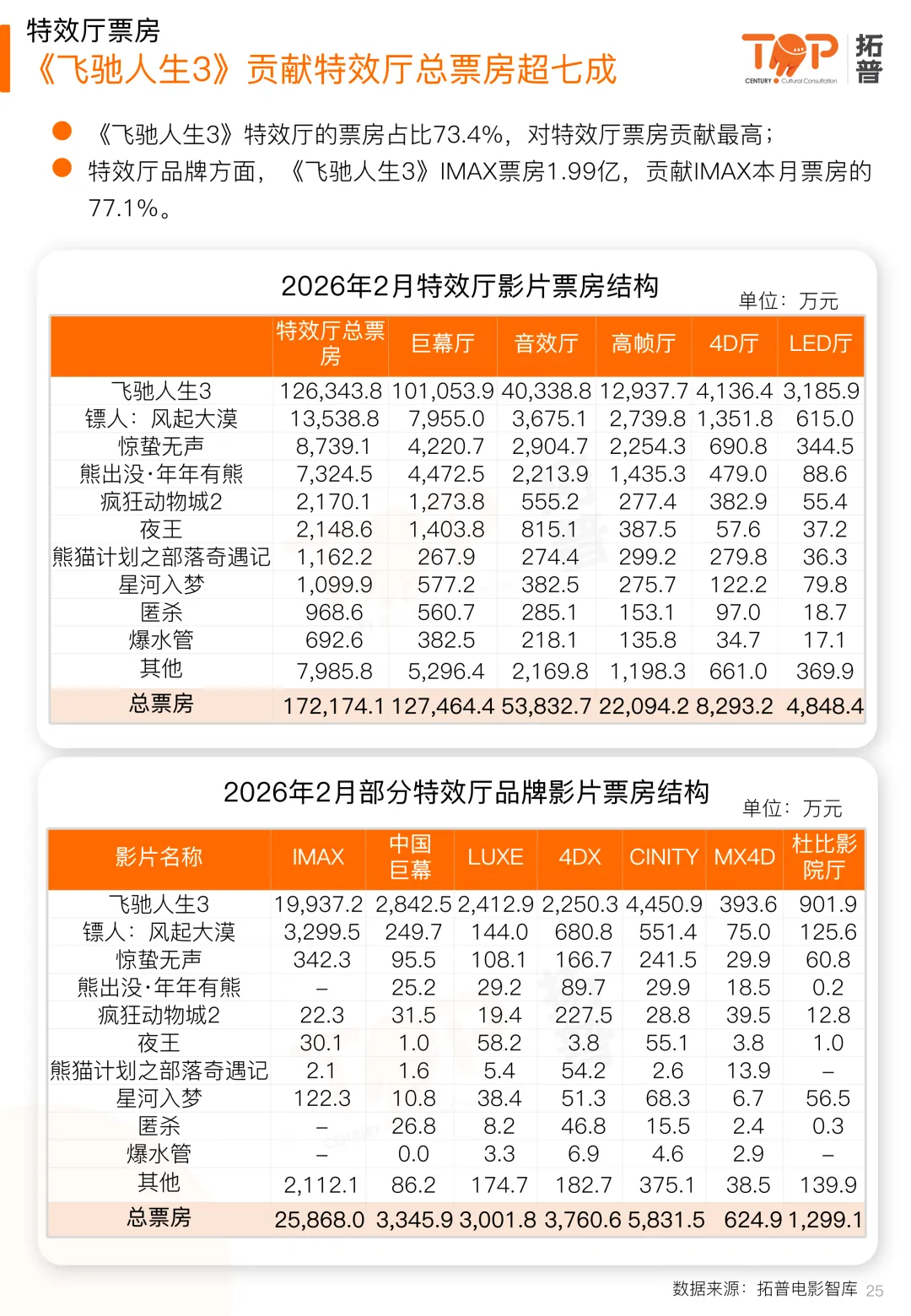 特效厅表现方面,本月特效厅总票房17.22亿,同比去年下降60.2%,表现不及普通厅(普通厅票房60.70亿,同比下降48.4%)。其中,不同属性特效厅中,LED票房跌幅较低,同比下降不到一成。影片方面,《飞驰人生3》特效厅票房遥居首位,贡献2月特效厅总票房的73.4%。