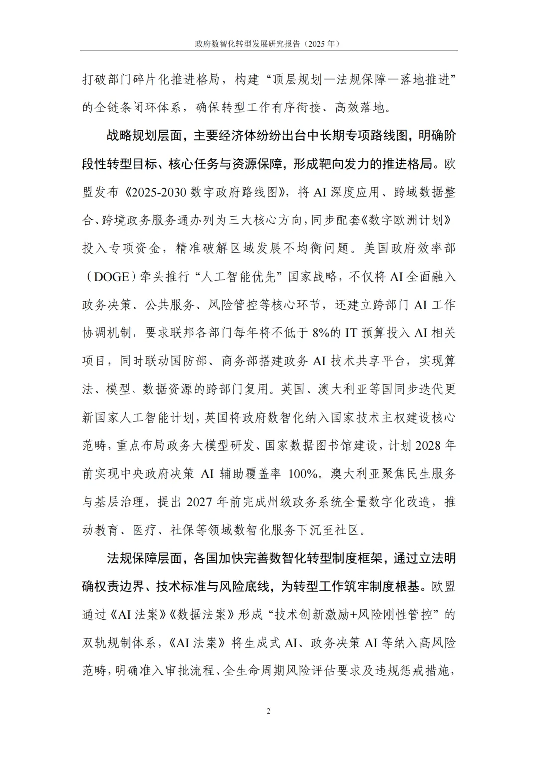 战略引领系统化:各国将其上升为国家核心战略,构建 “顶层规划 — 法规保障 — 落地推进” 闭环体系,如欧盟发布专项路线图、美国推行 “人工智能优先” 战略,新加坡通过立法确立 “数字优先” 原则。