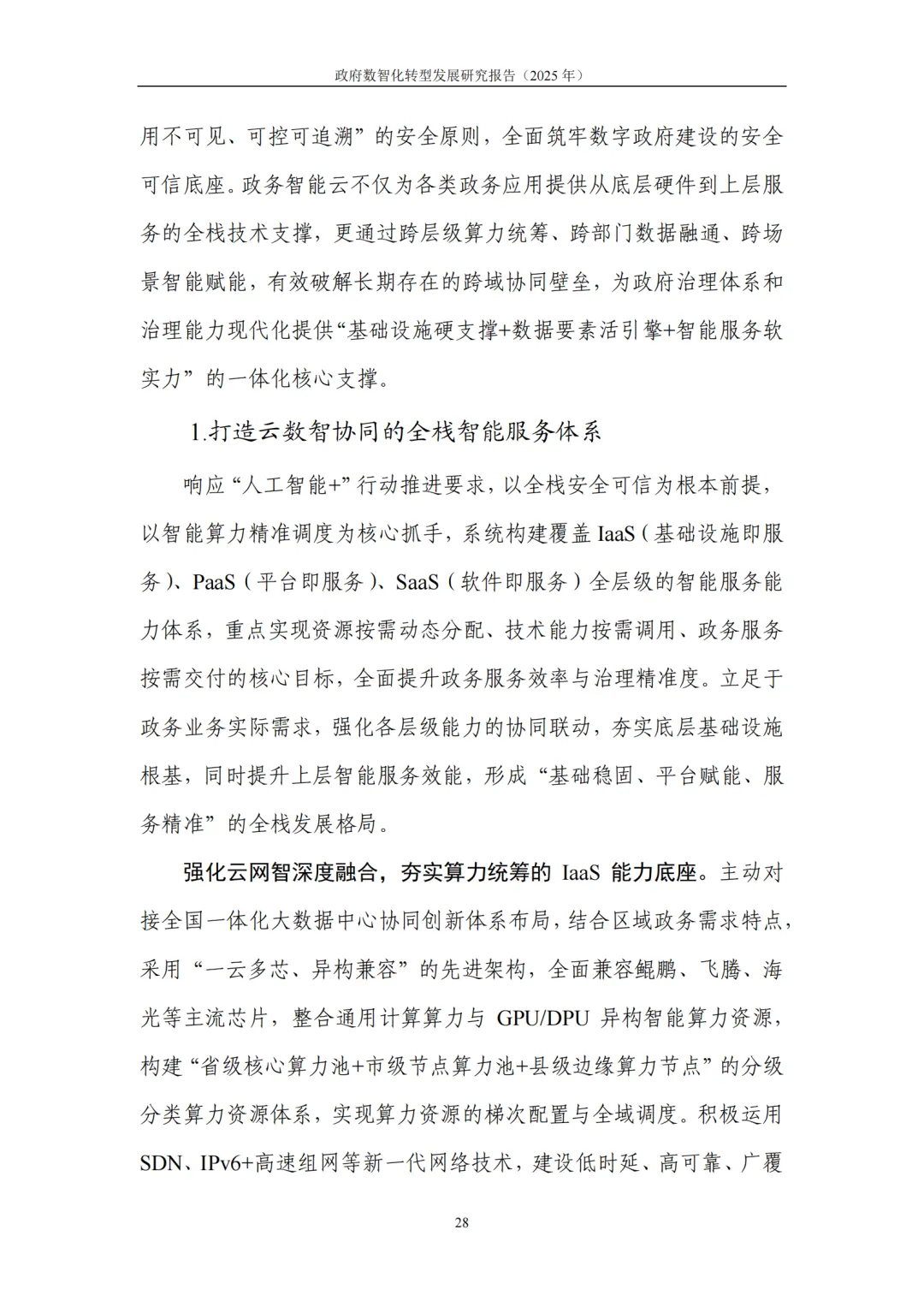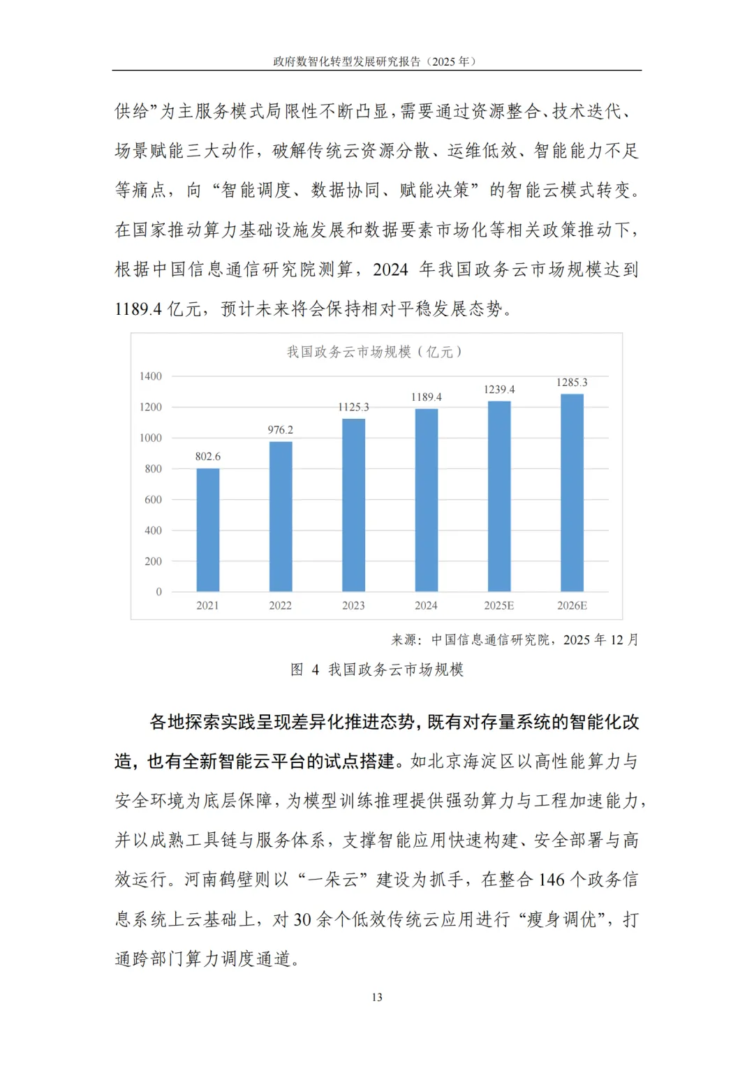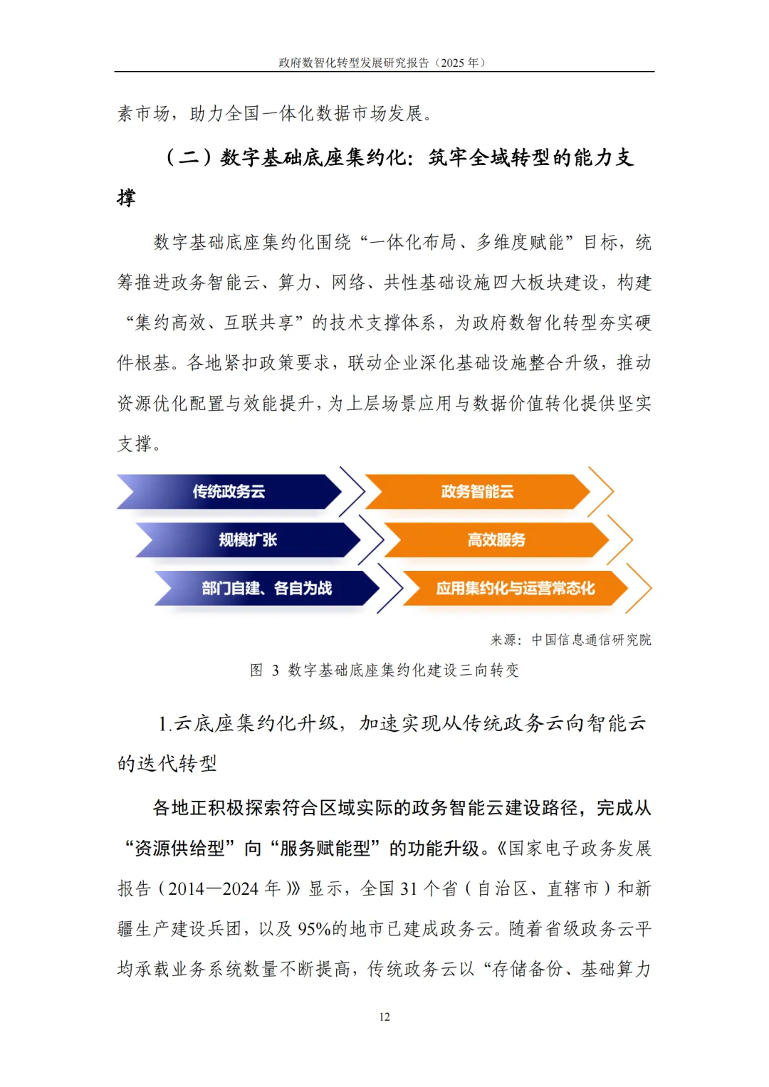 数字基础底座集约化:政务云向智能云迭代,2024 年市场规模达 1189.4 亿元;算力布局从规模扩张转向高效服务,东西部差异化发展;共性平台统建营用,整合通用能力并建立常态运营机制。