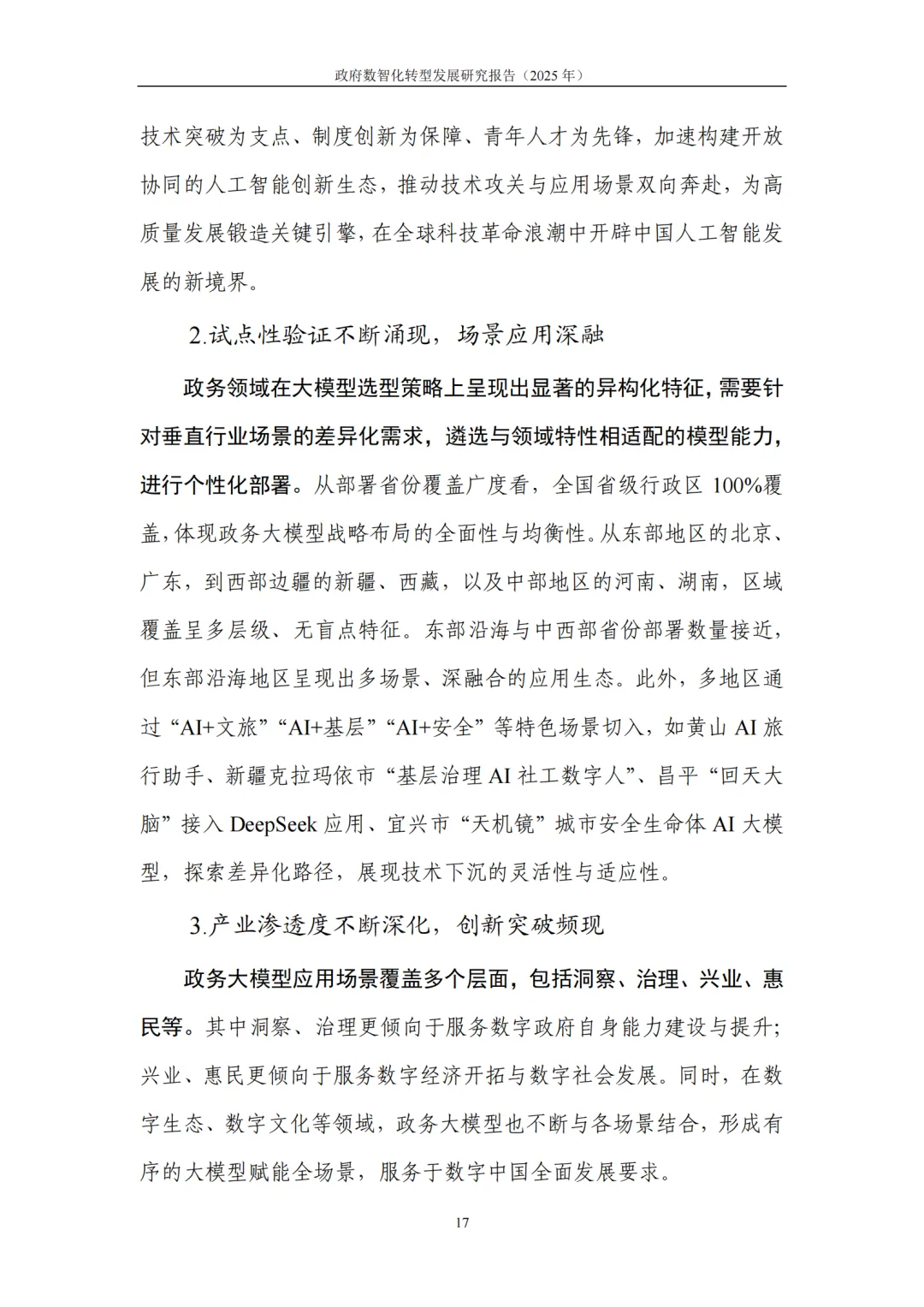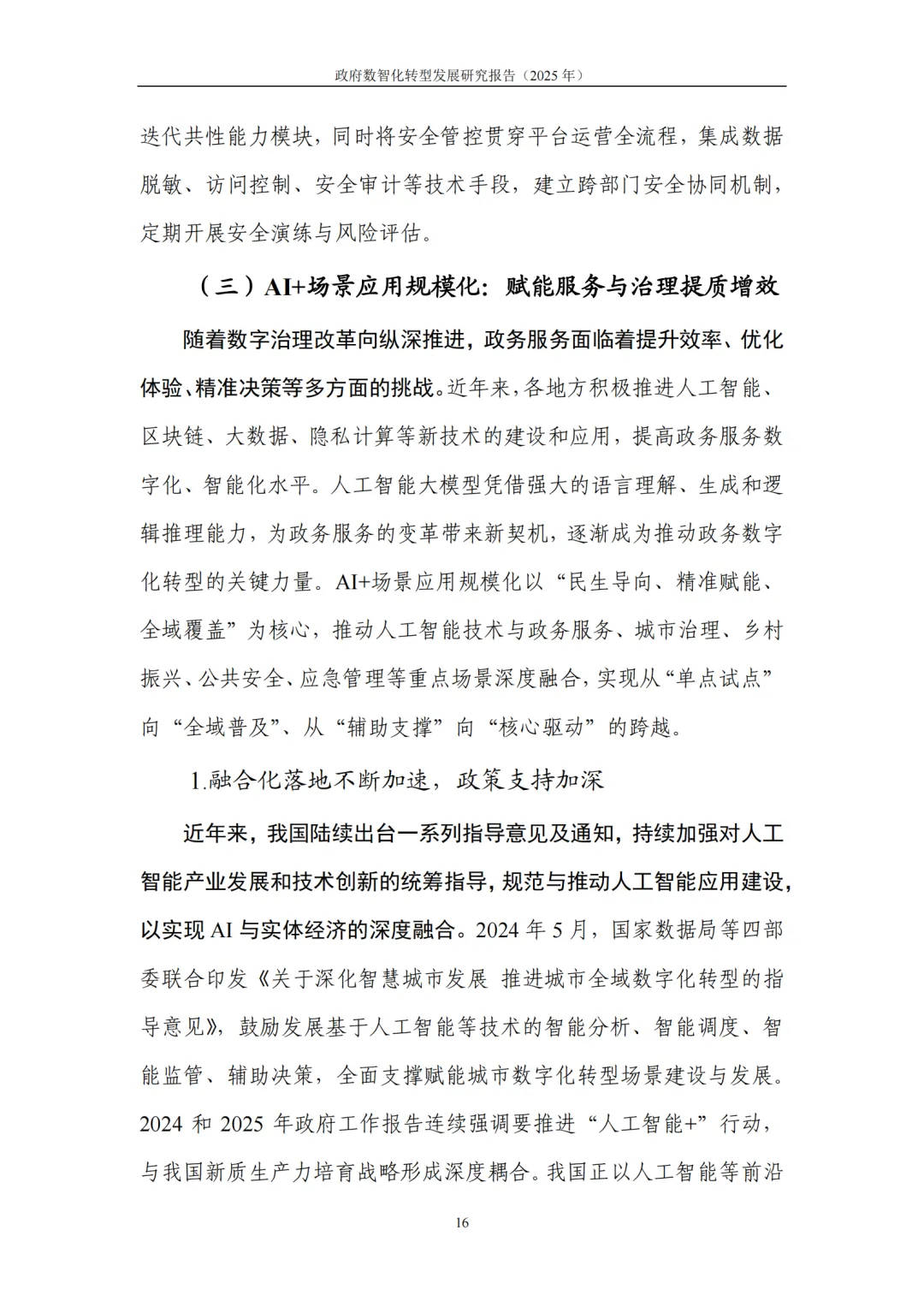 应用范式:政务大模型从通用试点走向领域深耕,细分场景专用模型投用,构建全链条赋能体系,完善安全评估与迭代优化机制,成为治理效能提升的智能引擎。