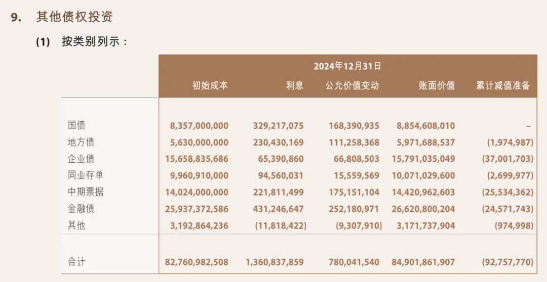 除了分析其利率、减值准备,其实还是更要看几大重要指标下,中金在资产配置方面的合理性是如何产生的?这个对于投资者而言也值得学习。更值得关注的是,除了一些比较分散的债券外,其余的公允价值变动收益为正数,总收益达7.8个亿,说明债券组合的收益还是比较可观的,有将近1%的上涨,加之利息收益将近1.6%个点,总共有2.6%个点,这么一算,其他债权投资作为资产种不可或缺的一种,确实是值得去规划深入发展的。