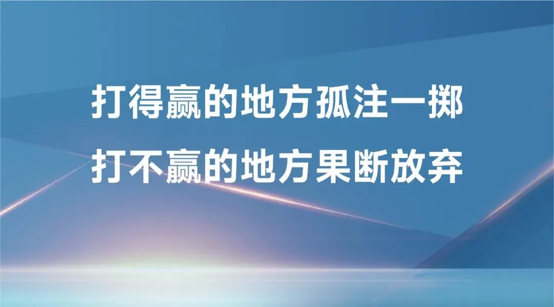 分散资源其实是很大的风险,在资源有限的情况下,要把所有的鸡蛋放在一个篮子里,如果你在每个领域都半生不熟,就很容易被竞争对手吞噬或击败。在自己有胜算的领域,能够打得赢的地方要敢于孤注一掷,打不赢的地方果断放弃。胜利属于能够在决定性的地点集中起最大兵力的一方,在局部形成必胜力量,并逐步建立起强大壁垒。