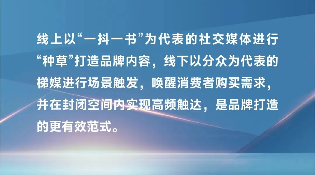 凯度大中华区CEO王幸指出,线上以“一抖一书”为代表的社交媒体进行“种草”打造品牌内容,线下以分众为代表的梯媒进行场景触发,唤醒消费者购买需求,并在封闭空间内实现高频触达,是品牌打造的更有效范式。