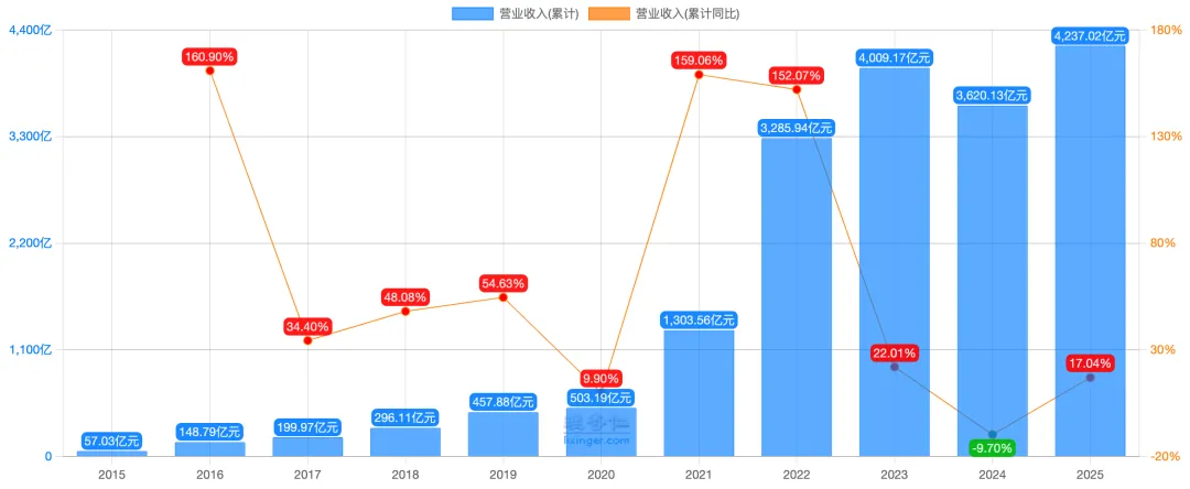 宁德时代2025年营业收入为4237.02亿元,同比增长17.04% ,见下图:
