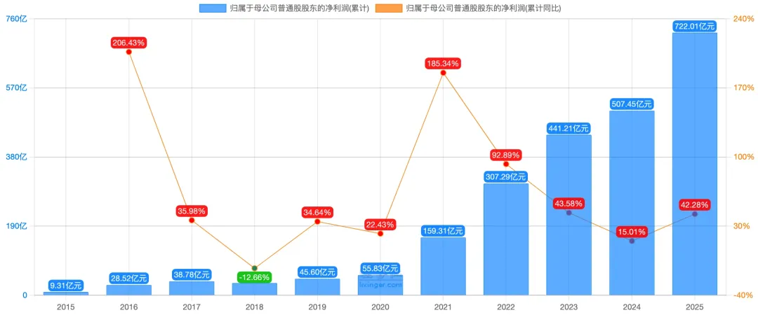 归母净利润为 722.01 亿元,同比增长 42.28% ,利润增速显著跑赢收入;扣非归母净利润 645.08亿元,同比增长 43.37% ,盈利质量高,非经常性损益影响小。