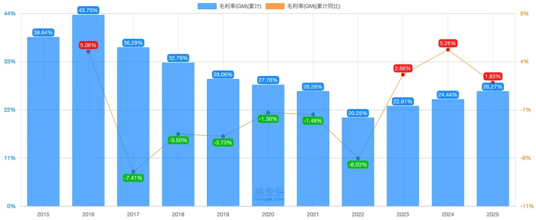 毛利率从去年的 24.3% 提升约2个百分点至 26.3% ,创近四年来新高,见下图: