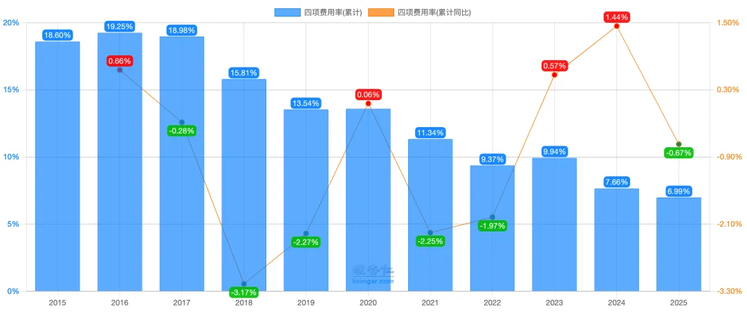 费用方面,四项费用率创历年新低为 6.99% ,主要来源于财务费用率的下降,去年财务费用为 -41.32亿 ,今年为 -79.4亿元 ,见下图: