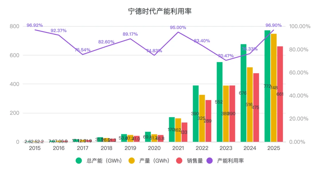 总产能772GWh,产量748GWh,销售量661GWh,动力电池 + 储能电池双重需求驱动,订单排期已至 2026 年,尤其储能业务增速超 50%,成为产能消化主力。