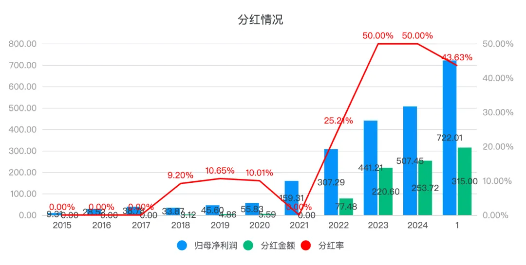 最后拟向全体股东每 10 股派发现金分红 69.57 元 (含税),合计分红 315 亿元,分红率约 43.6% 。