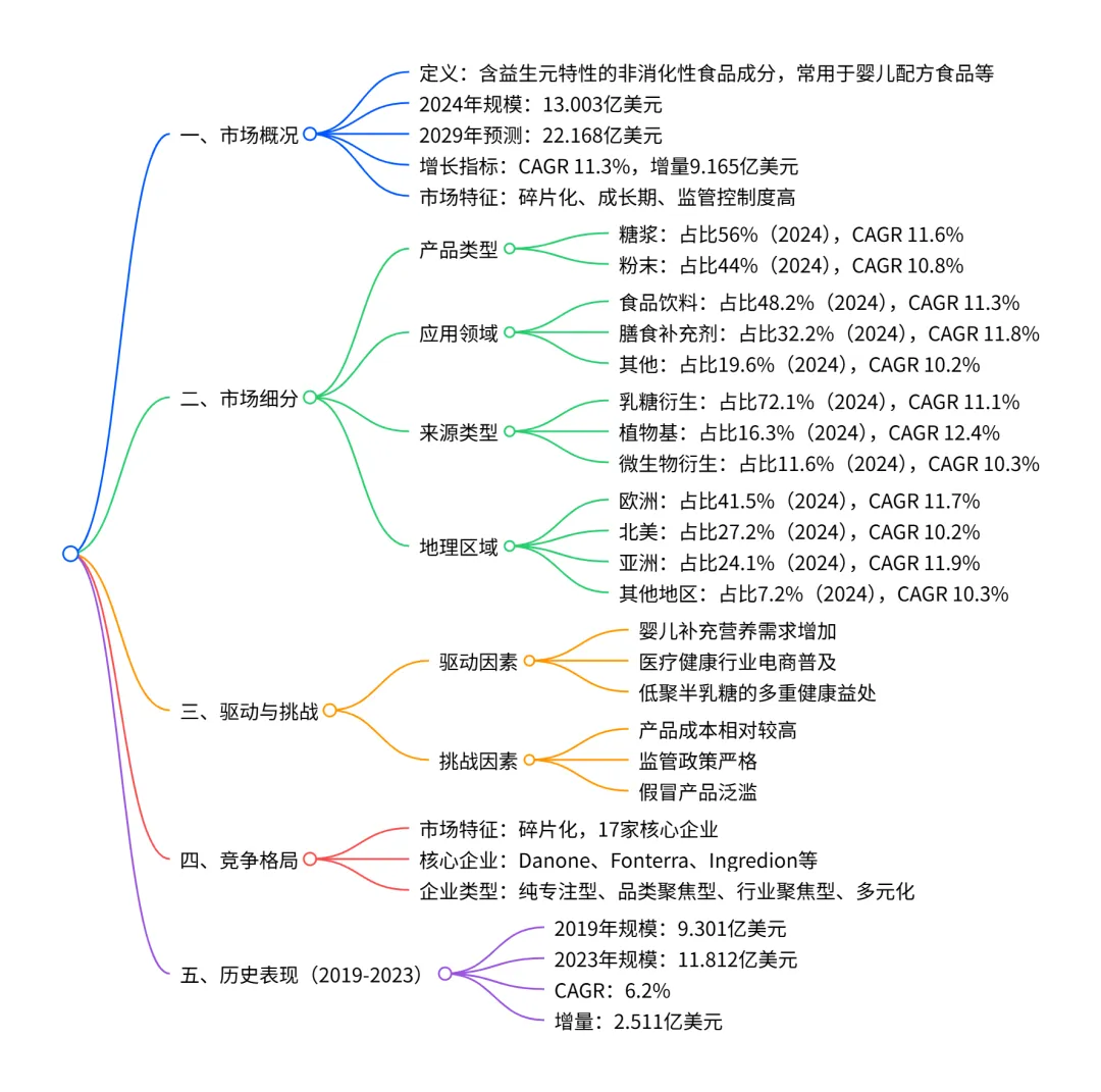 全球低聚半乳糖(GOS)市场在2024年规模达13.003亿美元,预计2024-2029年以11.3%的 CAGR增长至22.168亿美元,增量增长9.165亿美元;市场呈碎片化特征,欧洲为最大区域市场(2024年占比 41.5%),亚洲是增长最快区域(CAGR 11.9%);产品类型中糖浆占主导且增长最快(CAGR 11.6%),应用端以食品饮料为最大领域(2024年占比48.2%),膳食补充剂增长最快(CAGR 11.8%),来源上乳糖衍生占比最高(2024年72.1%),植物基增长最快(CAGR 12.4%);驱动因素包括婴儿补充营养需求增加、电商普及及健康益处,挑战主要是产品成本高、监管严格及假冒产品问题,市场竞争涉及 Danone、Fonterra 等17家核心企业。