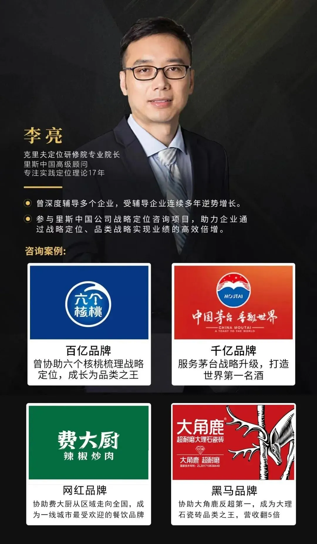 作为克里夫定位研修院专业院长,李亮老师曾受多家MBA院校、企业邀请进行定位理论培训与演讲,其中包括:茅台、六个核桃、老板电器、百洋医药、红豆集团、志邦家居、克明面业、苏宁、通用轮胎、新农哥、正和岛、长江商学院、上海大学、天津大学、南京师范大学、中关村创新中心等企业与机构,拥有非常丰富的品类战略教学与实战经验。