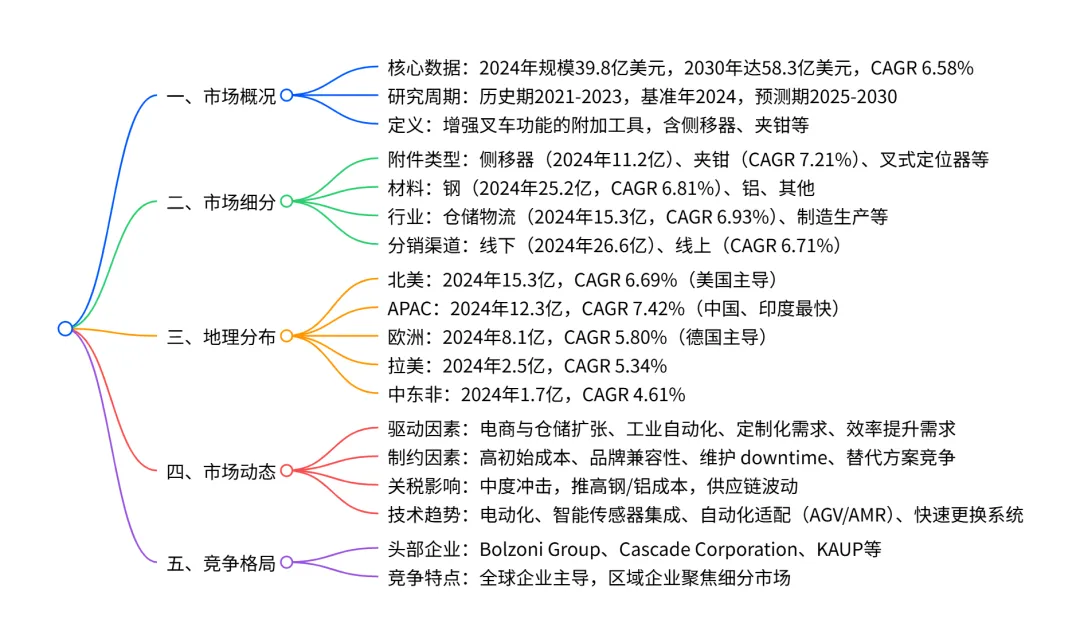 全球叉车附件市场 2024 年规模达39.8亿美元,预计2030年增至58.3亿美元,CAGR 为6.58%,其中APAC地区以 7.42%的CAGR成为增长最快区域;市场按附件类型、材料、行业、分销渠道细分,夹钳类附件(CAGR 7.21%)和仓储物流行业(CAGR 6.93%)增长突出,线下分销渠道(2024 年26.6亿美元)仍占主导但线上渠道增速更快(CAGR 6.71%);驱动因素包括电商扩张、工业自动化、定制化需求,制约因素涉及高初始成本、兼容性问题等,关税战对原材料成本和供应链产生中度影响,市场竞争激烈,由 Bolzoni Group、Cascade Corporation 等全球企业主导,技术趋势聚焦电动化、智能化和自动化集成。