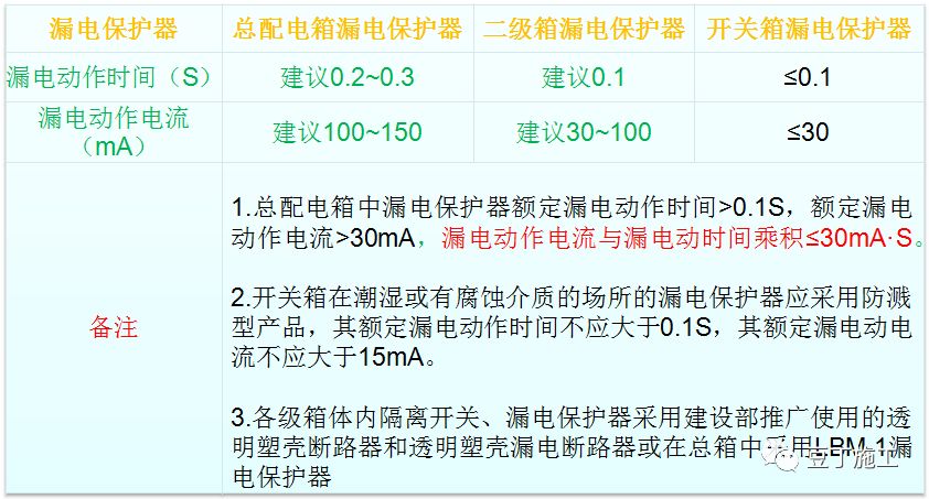 (九)、开关箱中漏电保护器的额定漏电动作电流严禁大于30mA,额定漏电动作时间严禁大于0.1s;总配电箱中漏电保护器的额定漏电动作电流必须大于30mA,额定漏电动作时间必须大于0.1s≦0.2s,宜使用额定漏电动作电流150mA,额定漏电动作时间0.2s,总原则必须是额定漏电动作电流与额定漏电动作时间的乘积不大于30mA.s。
