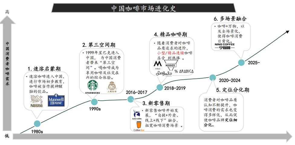中国咖啡发展历程:从速溶咖啡主导到咖啡多场景融合发展阶段。