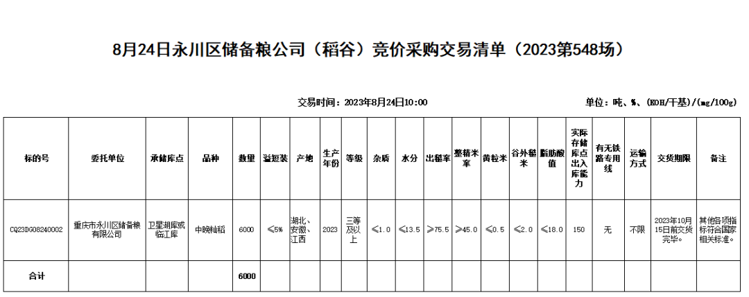 受重庆市永川区储备粮有限公司委托,重庆市粮油批发市场有限责任公司(即国家粮食重庆交易中心,以下简称“批发市场”)定于2023年8月24日10:00举办永川区储备粮公司(稻谷)竞价采购交易会,现将有关事项公告如下: