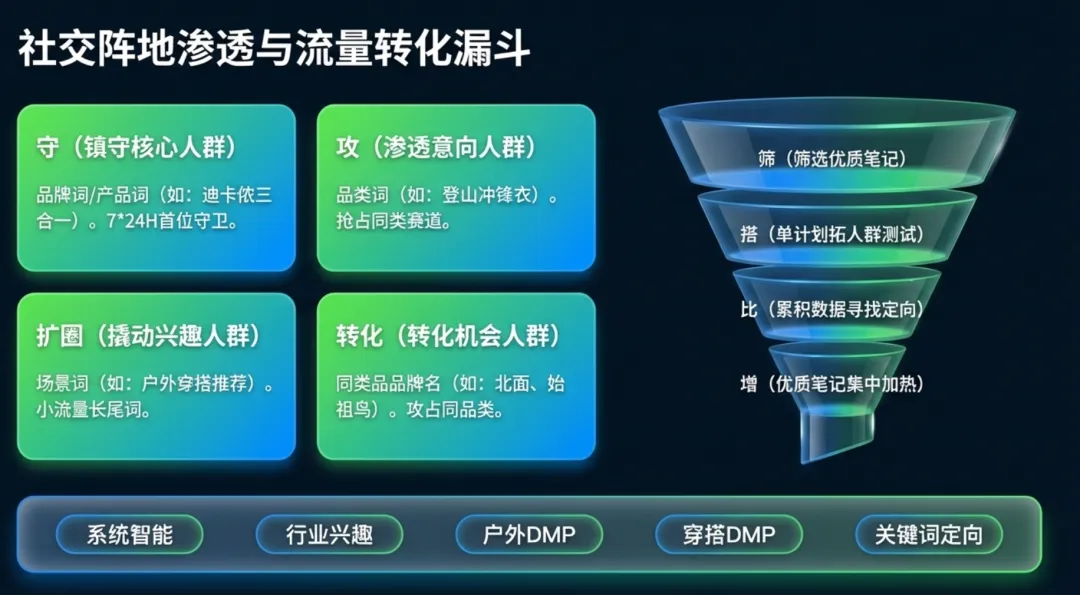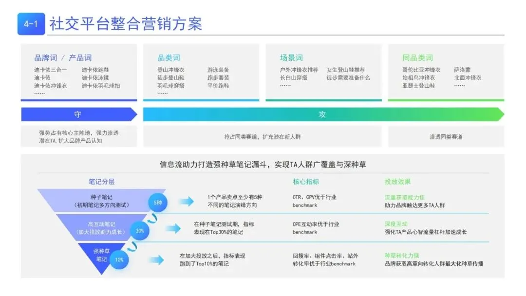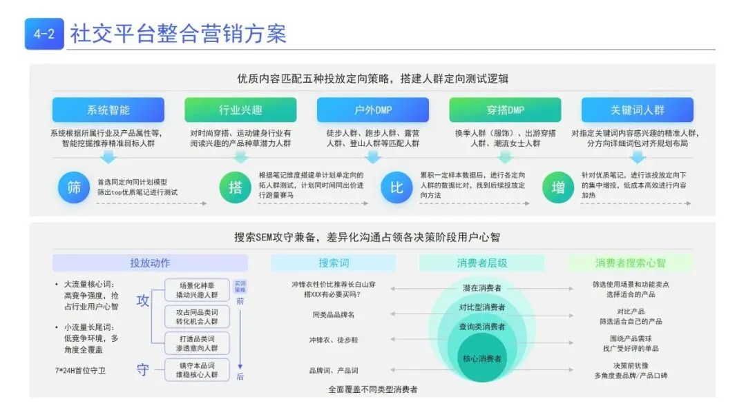 | 守:强势占有品牌/产品核心词,维稳核心人群;攻:抢占品类/竞品词,渗透潜在人群。搭配笔记分层赛马(种子/高互动/高转化笔记)+ 多定向投放,实现人群广覆盖与深种草 | 户外、服饰等品类的小红书/抖音等社交平台整合营销,品牌产品认知扩大 |