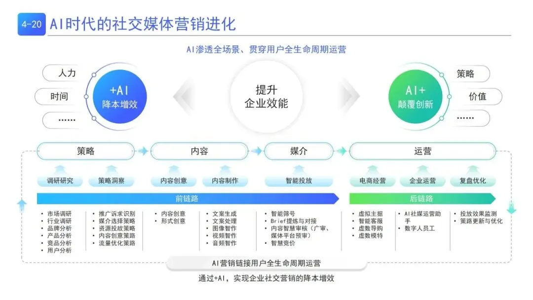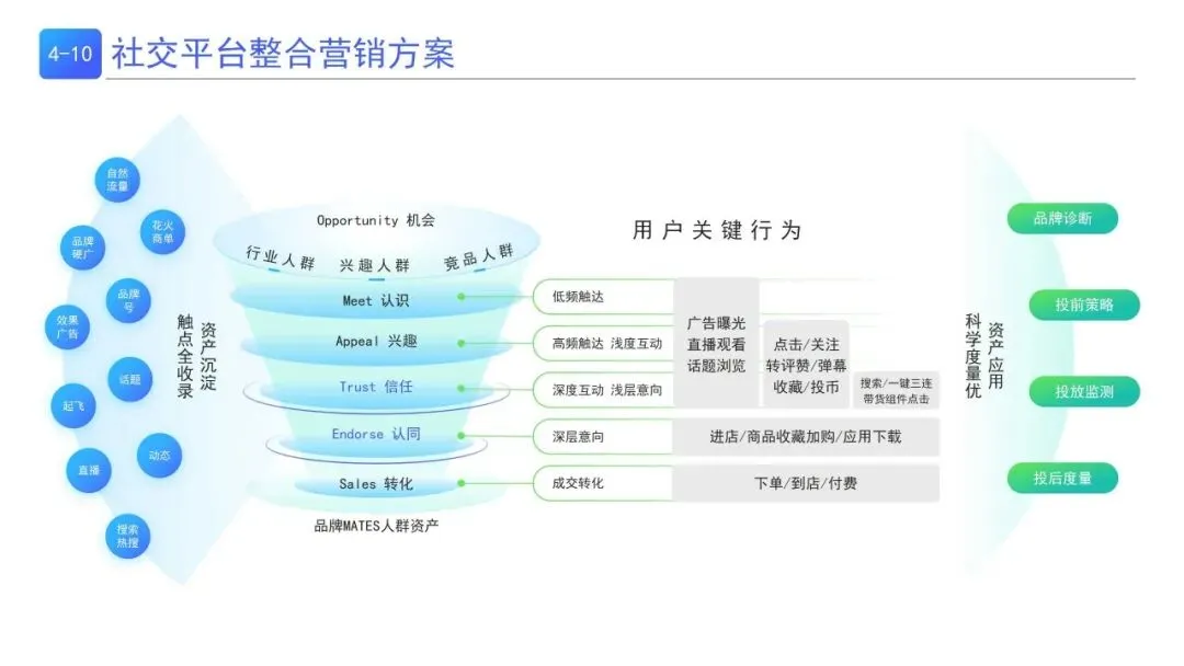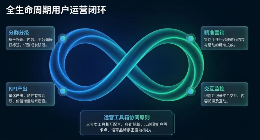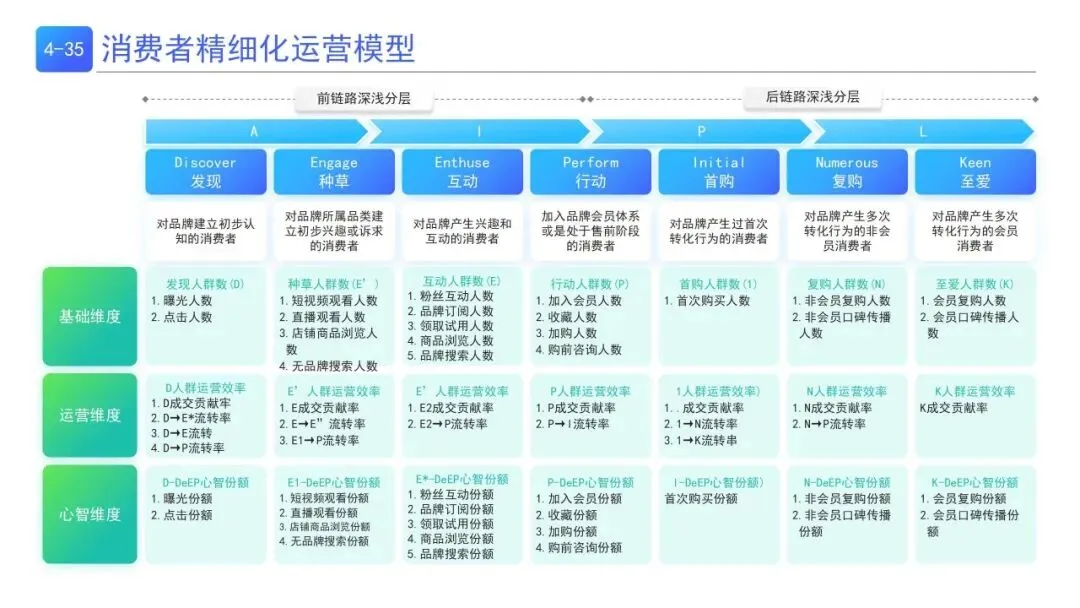 | 前链路AIPL(发现-种草-互动-行动)+ 后链路DENK(首购-复购-至爱),分层统计人群指标,从基础/运营/心智三维度精细化运营,实现人群正向流转 | 品牌全生命周期消费者管理,精准触达不同转化阶段用户 |