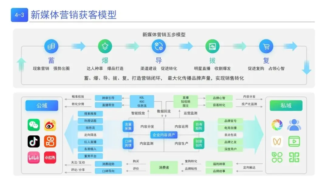 | 打造蓄-爆-导-拔-复营销闭环,依次实现心智占领、现象出圈、促进转化、收割爆发、复购提升,联动公域私域、达人/KOL、短视频/直播等多渠道 | 全品类新媒体全域获客,品牌声量传播与销售转化一体化运营 |