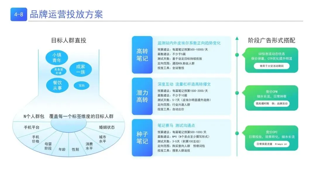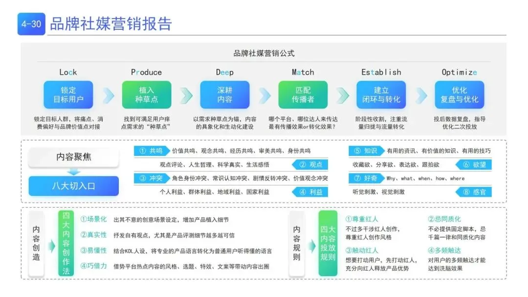 | 按锁定人群-植入种草点-建立内容-深耕传播-优化复盘五步走,以八大内容切入口打造优质内容,结合多频触达、场景化等创作规则实现种草转化 | |